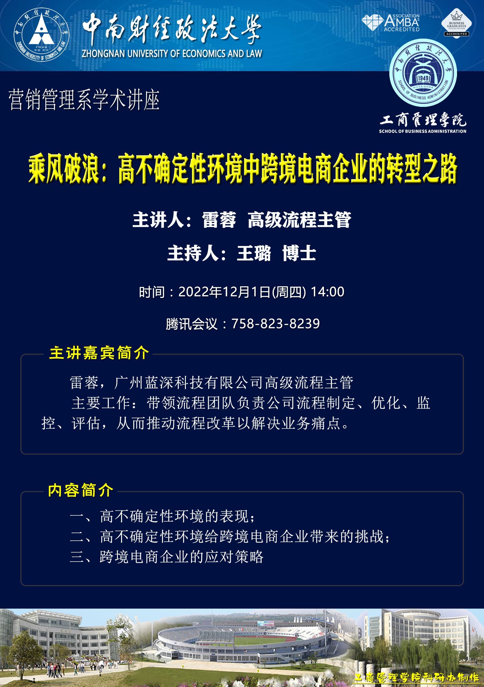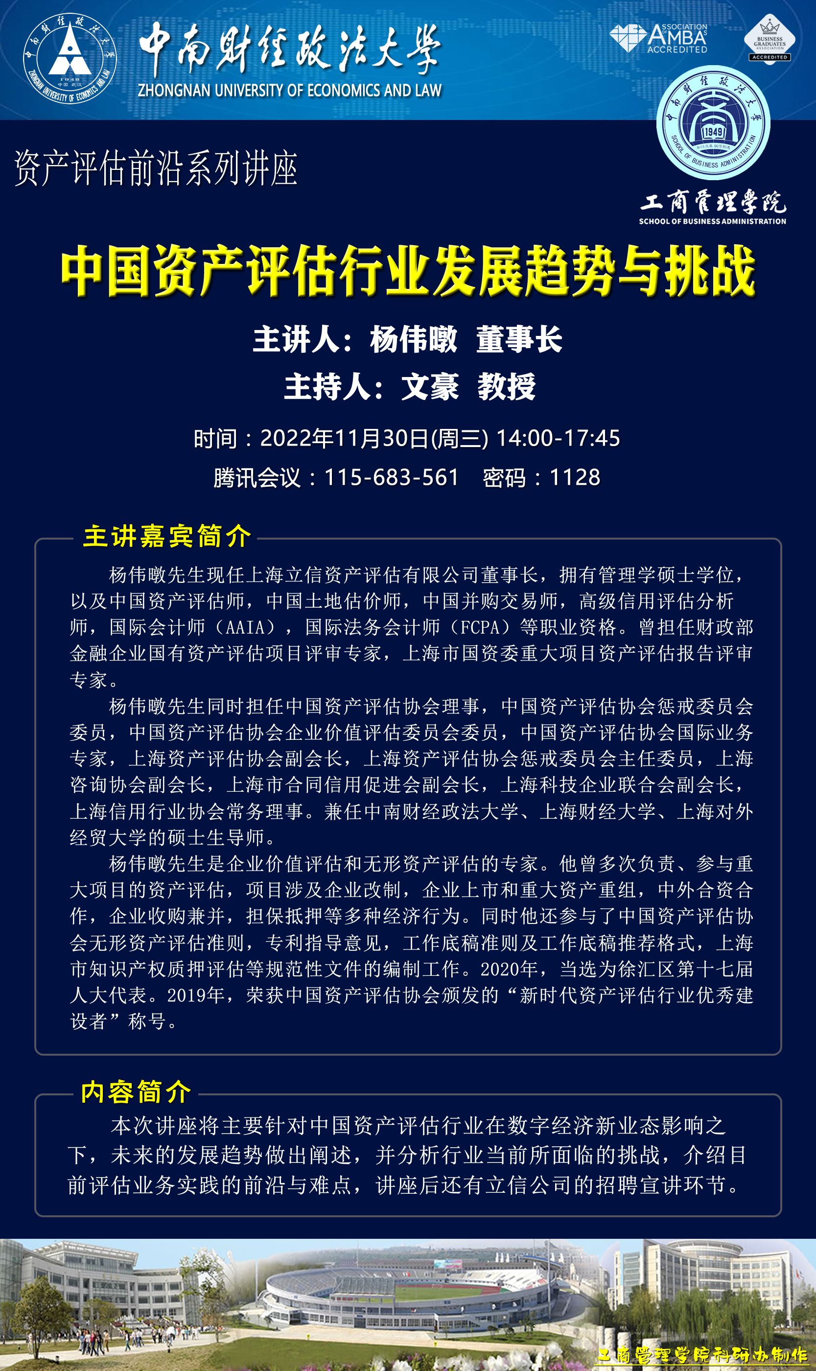 时间地点主办单位主持人主讲人主题2022.11.30 14:15-17:45腾讯会议:115-683-561密码:1128工商管理系文豪 教授杨伟暾(董事长、高级经济师)中国资产评估行业发展趋势与挑战2022.12.1 14:00-15:30腾讯会议:758-823-8239营销管理系王璐 博士雷蓉(高级流程主管)乘风破浪:高不确定性环境中跨境电商企业的转型之路