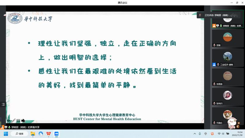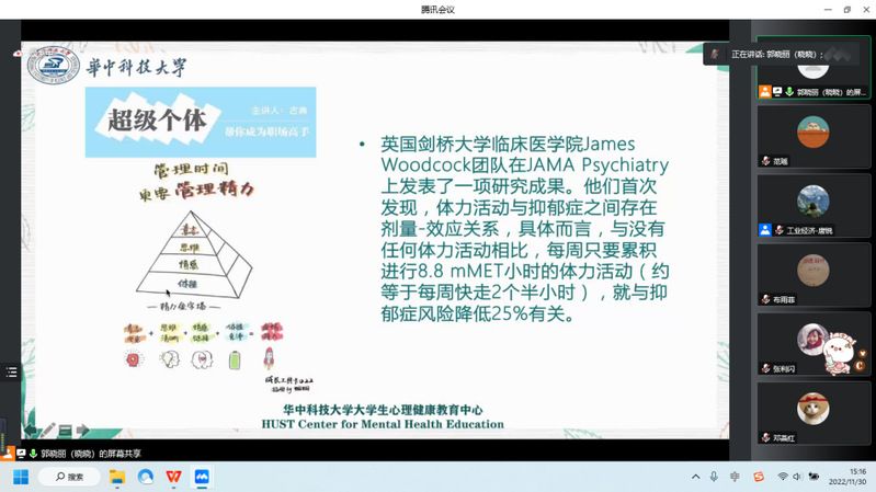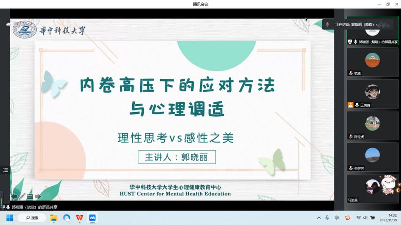 (通讯员:范瑶)为帮助新生尽快适应研究生生活,缓解学术科研等压力情境引起的情绪焦虑,通过积极的心理调适更好的应对“内卷”,2022年11月30日下午14:30,工商管理学院成功举办了“内卷高压下的应对方法与心理调适”心理健康专题讲座。本次讲座特邀请中国心理学会注册心理师、华中科技大学心理健康教育中心副主任郭晓丽老师结合当下最受学生关注的心理话题之一“内卷”进行分享,学院全体2022级硕士研究生参加。