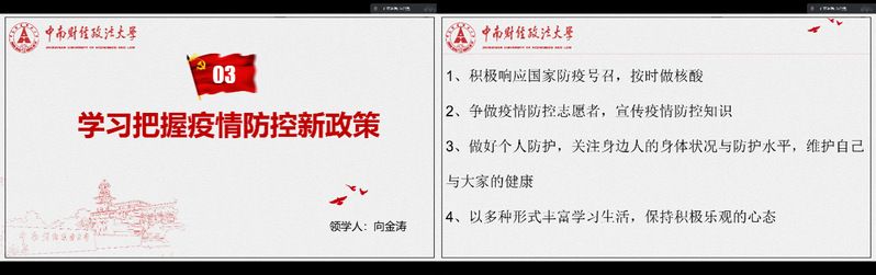 在学习把握疫情防控新政策环节,领学人向金涛带领大家学习疫情防控二十条,并将其概括为“五个调整”、“一个不再”、“一个取消”、“七个不得”、“八个加强”以及“一个严禁”。在领学的最后,向金涛同学也就我们该如何配合学校疫情防控工作提出了几点建议,希望大家能够做到。