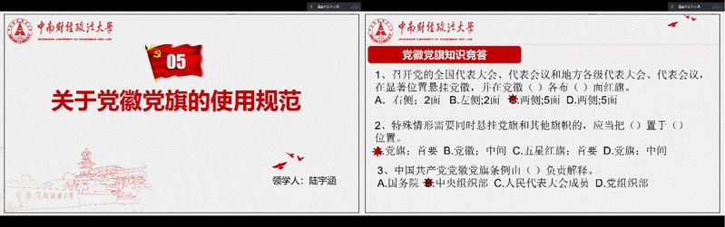最后,领学人陆宇涵向大家科普如何规范使用党徽党旗。通过介绍《中国共产党党徽党旗条例》与开展党徽党旗知识竞答,希望大家在以后的活动中都能正确规范地使用党徽党旗。