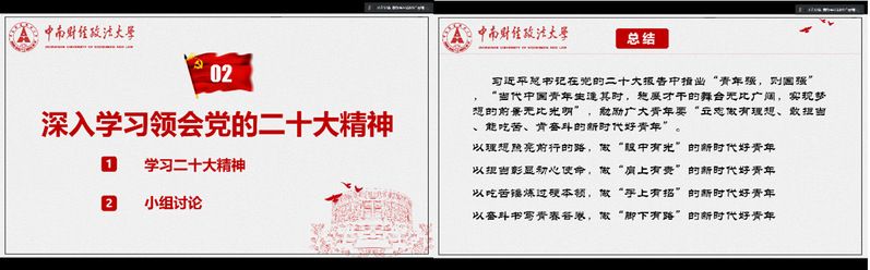 领学人肖云雅带领大家深入学习领会党的二十大精神。从党的二十大的主题、过去五年的工作和新时代十年的伟大变革、开辟马克思主义中国化时代化新境界、新时代新征程中国共产党的使命任务等九大方面,全面介绍了二十大精神框架的具体内容。并通过小组讨论与分享的形式,加深了同学们对二十大精神的理解,鼓励大家成为新时代好青年。