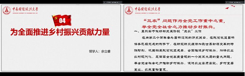 在此之后,由余立睿同学领学为全面推进乡村振兴贡献力量的相关内容。一方面,介绍了习近平总书记在陕西延安和河南安阳的考察; 另一方面,介绍了习近平总书记关于解决好“三农”问题的重要报告及其提出的要求。并通过观看来自电影《一点就到家》的视频片段,让大家深刻理解全面推进乡村振兴的重要意义。