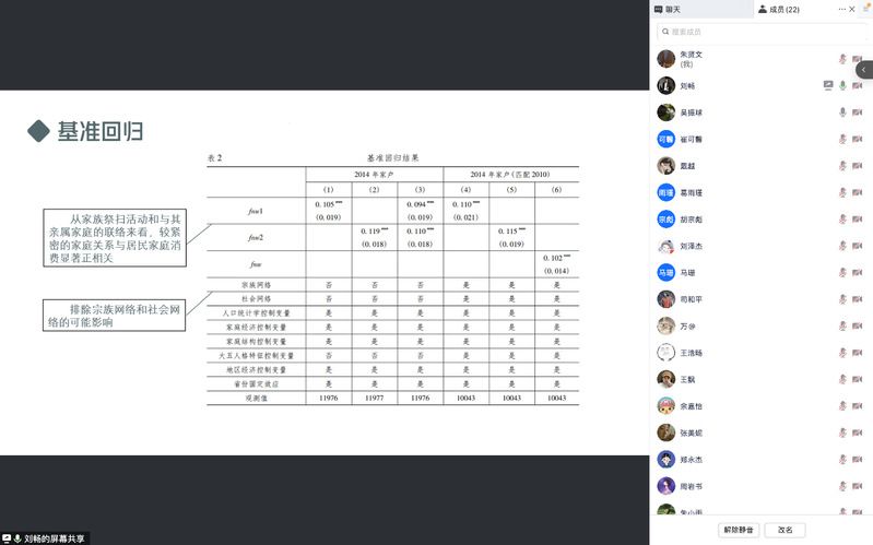 刘畅分享了由学者田子方、李涛和伏霖完成,发表在《经济研究》2022年第6期的一篇论文《家庭关系与居民消费》。本文利用2014年、2010年“中国家庭追踪调查”(CFPS)中家庭和成人问卷以及中国统计年鉴(2015)》数据,研究了独具特色的“分而不疏”的家庭关系对家庭消费产生的影响。为了解决反向因果带来的内生性问题,文章通过滞后一期居民家庭消费以及构建区县层面的集体主义文化和区县层面的家庭关系的工具变量。实证结果表明,较紧密的家庭关系对我国居民家庭消费有着显著且稳健的正向促进作用。与此同时,相对于家庭经济状况较好的家庭,贫困家庭中家庭关系对家庭消费的促进作用更为明显; 相对于有更好社会保障的家庭,风险暴露程度更多的家庭中家庭关系对消费的促进作用更明显; 相对于年轻家庭,户主为老年人的家庭中家庭关系对消费的促进作用更明显。这意味着在我国城市化加速发展和传统社会家庭关系解构的过程中,需要进一步健全社会保障、消除信息和资源鸿沟,以激发居民消费潜力,推动经济高质量发展。