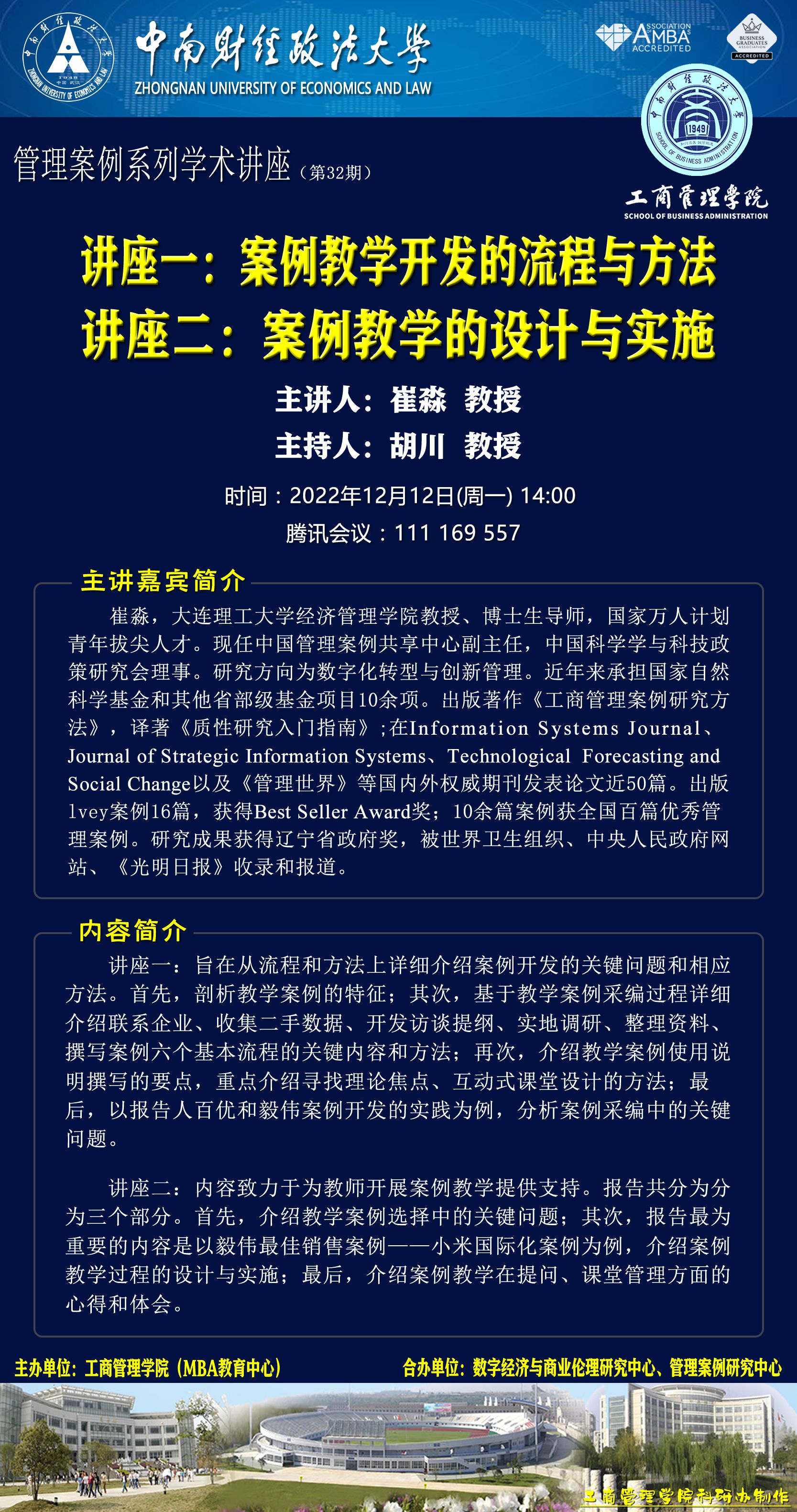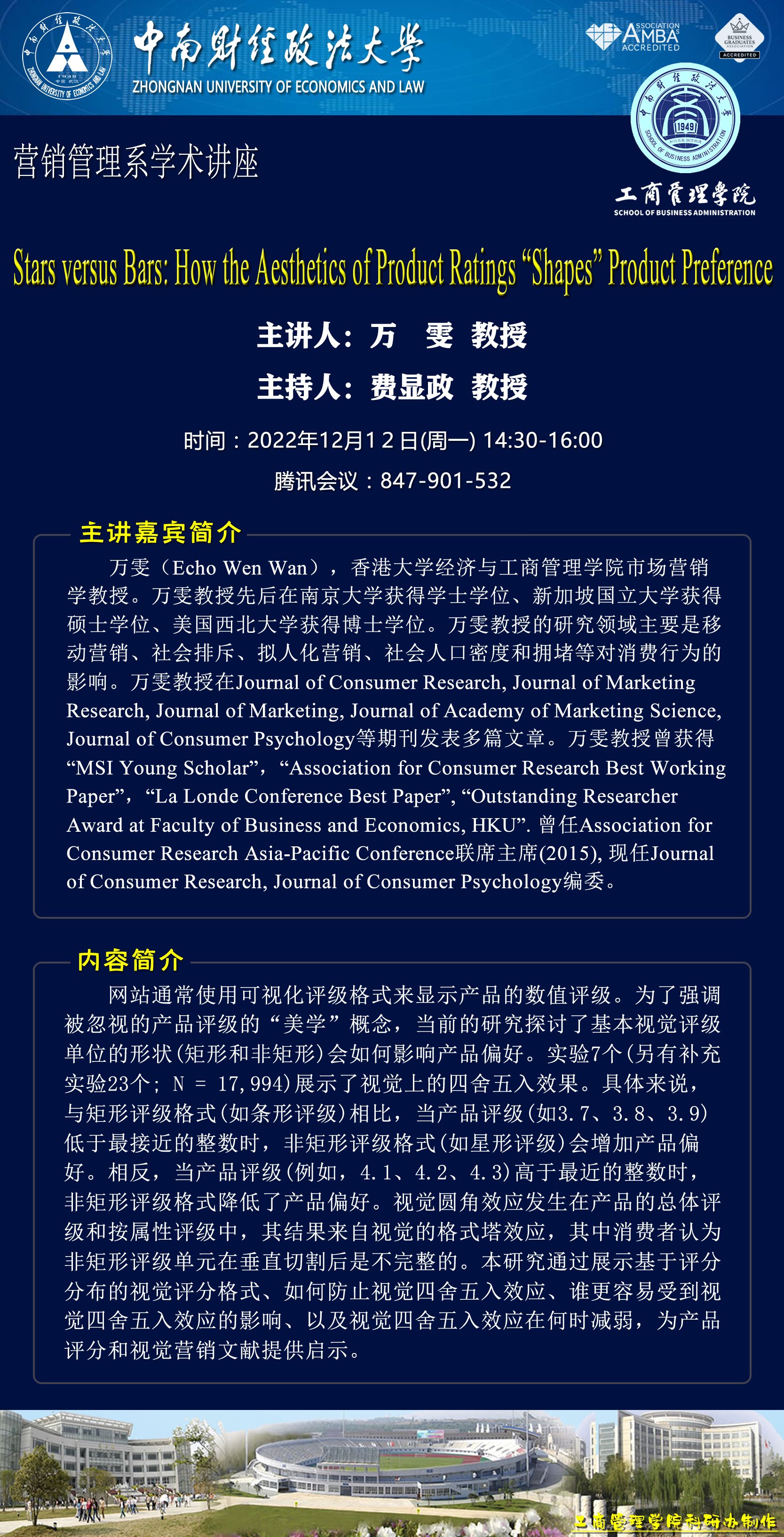 时间地点主办单位主持人主讲人主题2022.12.12 14:00腾讯会议:111-169-557工商管理学院(MBA教育中心)胡川 教授崔淼 教授主题一:案例教学开发的流程与方法主题二:案例教学的设计与实施2022.12.12 14:30-16:00腾讯会议:847-901-532营销管理系费显政 教授万雯 教授Stars versus Bars: How the Aesthetics of Product Ratings “Shapes” Product Preference(“星”还是“条”:如何对产品评分的“数字表达美学设计”进行优化?)2022.12.16 10:30-12:30腾讯会议:785-395-792旅游管理系李明龙 副教授白秀成 教授酒店和旅游业发展趋势与创新2022.12.17 10:30-12:30腾讯会议:610-188-214从共享经济和众包研究旅游目的地持续性发展