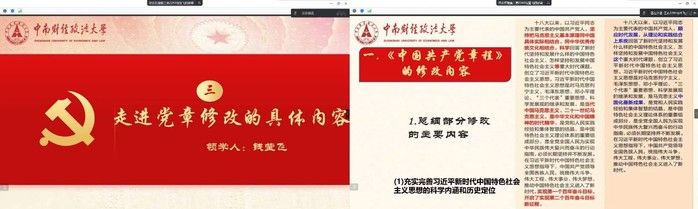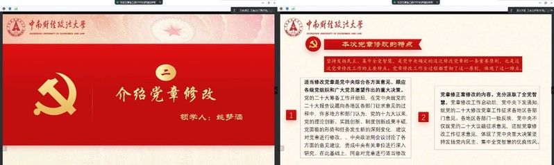接着,由领学人钱莹飞带领大家学习本次党章修改的具体内容。主要分为两部分进行学习,第一部分是学习总纲部分修改的主要内容,第二部分是学习条文部分修改的主要内容。后以呈现问答的形式共同学习党章修改后对不同部门的要求,重申党章修改的重要意义。