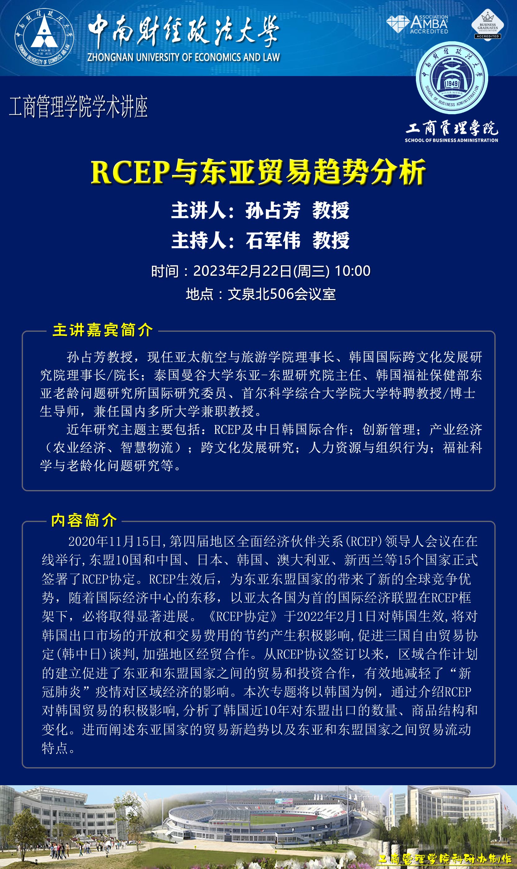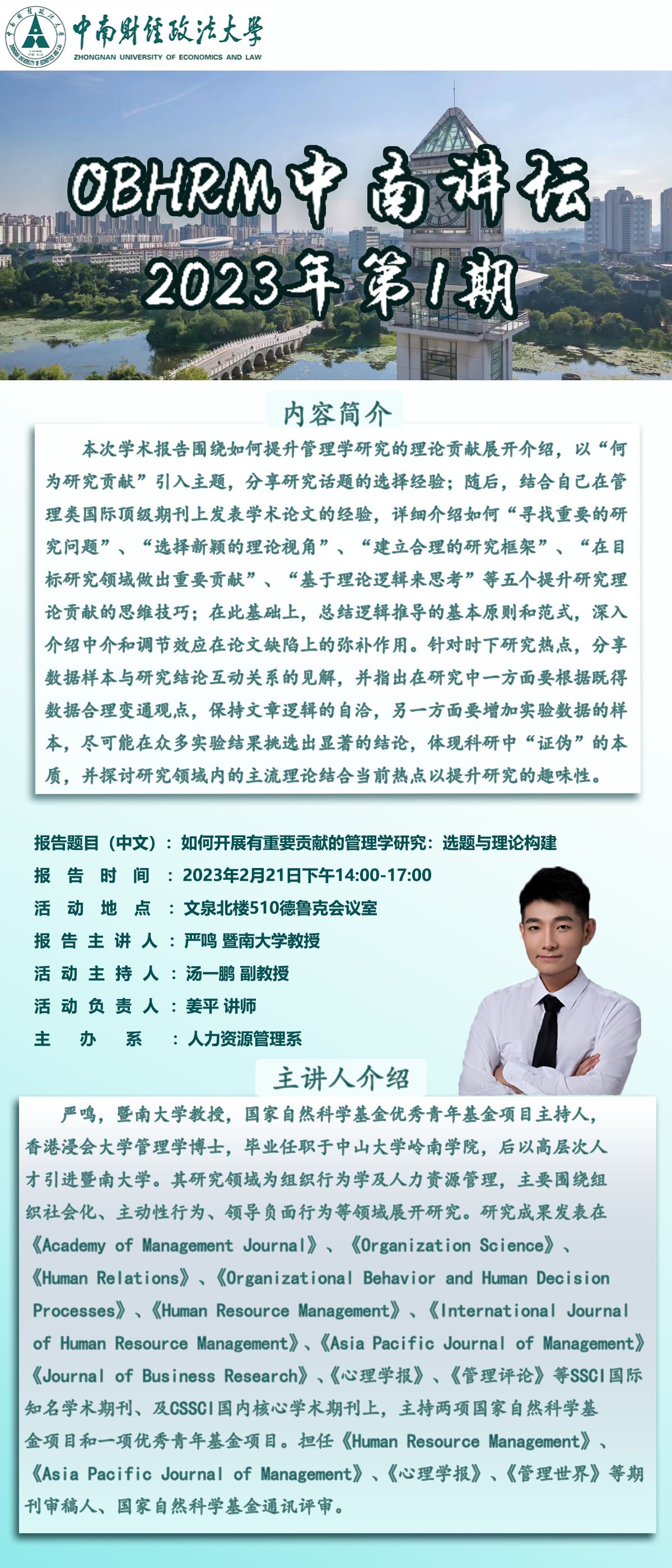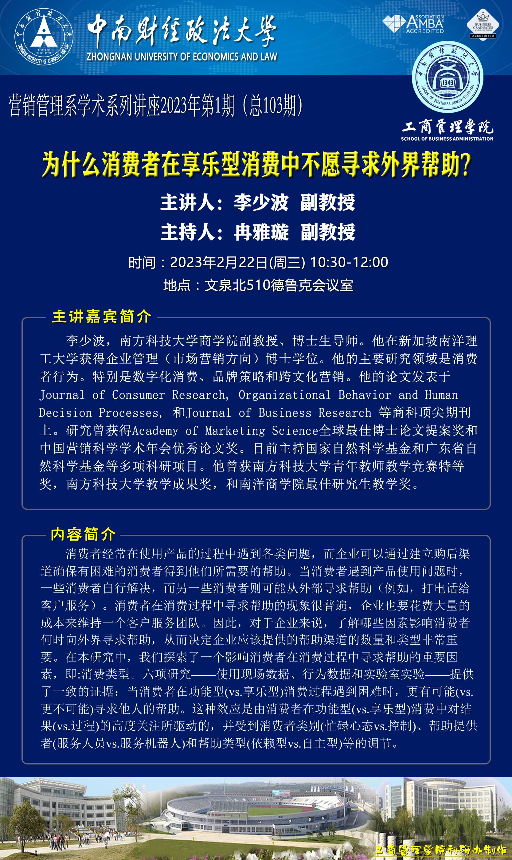 时间地点主办单位主持人主讲人主题2023.2.21 14:00-17:00文泉北510德鲁克会议室人力资源管理系汤一鹏 副教授严鸣 教授如何开展有重要贡献的管理学研究:选题与理论构建2023.2.22 10:00文泉北506会议室工商管理学院石军伟 教授孙占芳 教授RCEP与东亚贸易趋势分析 2023.2.22 10:30-12::00文泉北510德鲁克会议室营销管理系冉雅璇 副教授李少波 副教授为什么消费者在享乐型消费中不愿寻求外界帮助?