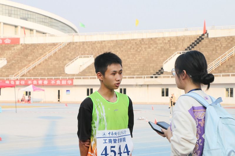 最后,他还向同学们分享了自己的跑步经验和技巧。他说道,跑步时尽量采用鼻吸鼻呼的方式,开始时要先慢跑热身,在进行了充分的拉伸和准备活动之后,可以采用间歇跑的训练方式来提高自我耐力。而在被问及明年是否有继续参赛的计划时,向继财明确表示自己会再次参加1500米项目,在接下来的一年里努力提升自我,争取明年卫冕冠军。他同样也表示出了对于加入校田径队的期待,渴望跑出校园,在省运会上一展风采,为财大荣耀添砖加瓦。