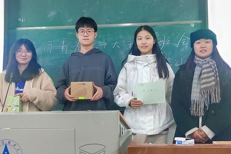 在国贸实验2101假期组织的“优秀笔记竞选”活动中,何君尧、李佳音、柳雨君三位同学表现优异,由学习委员崔同锦为他们颁奖并合影留念。