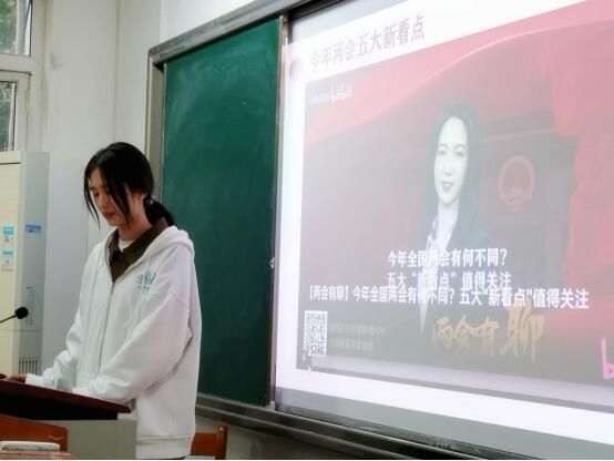 班会伊始,沈鑫儿同学带领同学们学习《二十届二中全会公报》核心观点,共同关注今年两会五大新看点,加深同学们对党最新理论实践的理解与学习,积极引导同学们成为党的坚定信仰者和忠实拥护者,让同学们在强化理论素养、坚定理想信念的同时,学习贯彻两会精神,筑牢青年使命担当。