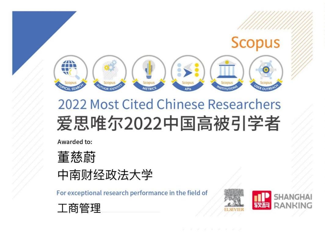 2023年3月28日,爱思唯尔(Elsevier)正式发布了2022“中国高被引学者”(Highly Cited Chinese Researchers)。我院董慈蔚教授成功入选工商管理学科高被引学者。据悉,这也是自2015年“中国高被引学者”榜单发布以来我校首次有学者入选。