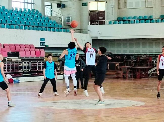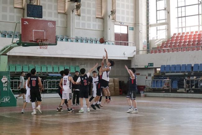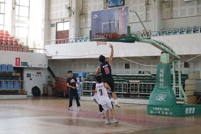 经过短暂的休整,时间来到了12:15,总决赛准时开始。一路过关斩将闯到最后的两支队伍分别为物管2001班与旅管2001、物管2101联队(下称旅管物管联队)。只听一声哨响,旅管物管联队主力47号薛宇凡凭借着身高优势抢到球权,与队长11号孙兆彤相互配合直逼篮板。物管2001队33号陈承玮不甘示弱当即跟上阻拦,但迫于对方绝对的身体优势,被旅管物管联队率先拿下4分。双方运动员个个生龙活虎,实力不分伯仲,对战激烈。0号旦增罗布一记远投后物管2001多点开花,22号刘为森两次长传,其他球员篮下接应配合默契,此时第一节比分9:6,物管2001暂时领先。次节伊始,随着旅管物管联队47号薛宇凡一记干净利落的盖帽,连得6分带领球队建立优势,稳住分差,物管2001的27号陆世豪强突篮下,造成对方12号余国豪防守犯规,两罚两中拉回比分,场上气氛逐渐热烈了起来。双方比分紧咬不下,上半场结束,比赛以24:24进入白热化阶段。