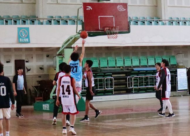 短暂休息后,下半场换边再战,贸经2001明显加强了内线的进攻,不断争抢前场篮板,对方24号沙吾尔走步违例,球权来到贸经2001方,14号陈俊文单节贡献8分,突破、上篮、快攻、抢断,在第三节中将分差拉至5分内。最后一节中两队你追我赶,分秒必争,工商贸经联队发起猛攻,4号黄新依靠低位杀伤、盯防,不断为队友送出妙传。外线24号沙吾尔,接连投出两个漂亮的空心三分球,紧接着0号何星星杀入禁区造成对方打手犯规,两罚稳稳命中,经贸2001抓住反击快攻的机会,多次造成篮下杀伤,试图在最后一分钟内将比分反超,但随着倒计时的结束,工商贸经联队以63:49的比分拿下胜利。