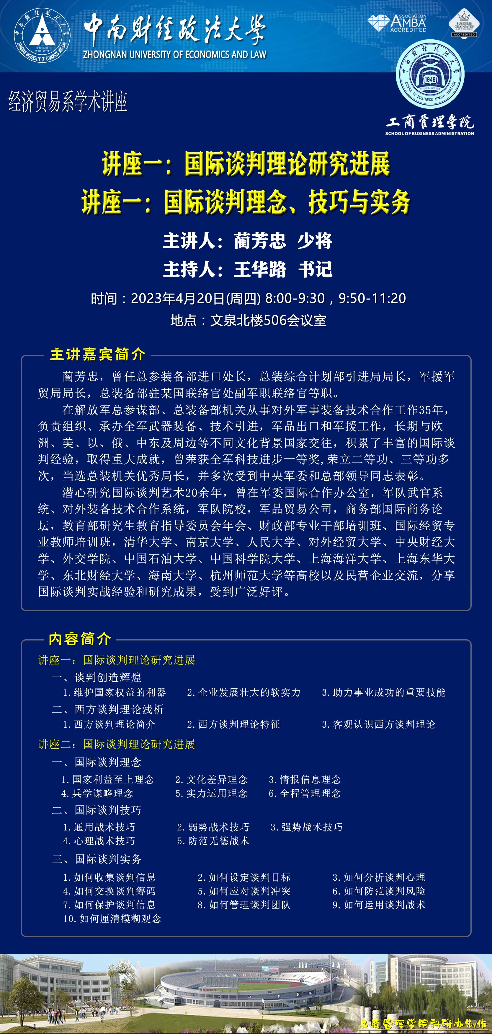 时间地点主办单位主持人主讲人主题2023.4.20讲座一:8:00-9:30讲座二:9:50-11:20文泉北楼506会议室经济贸易系王华路 书记蔺芳忠 少将讲座一:国际谈判理论研究进展讲座二:国际谈判理念、技巧与实务研究生报名链接:https://www.wjx.top/vm/eNrAa6h.aspx#2023.4.21 15:00-17:00文泉北楼307会议室经济贸易系毛海涛 副教授余心玎 副教授全球价值链量化研究(一)2023.4.22 15:00-17:00全球价值链量化研究(二)