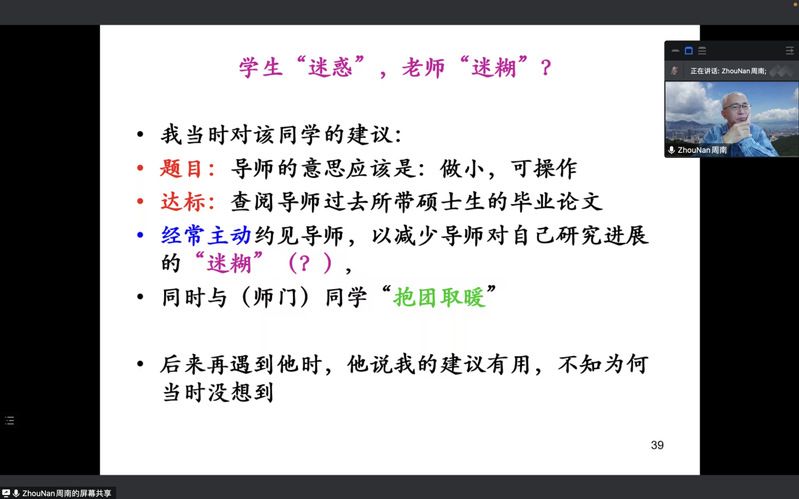 周南教授以在香港城市大学和深圳大学的带教经历引入讲座主题,强调了正确处理研究生师生关系的必要性。