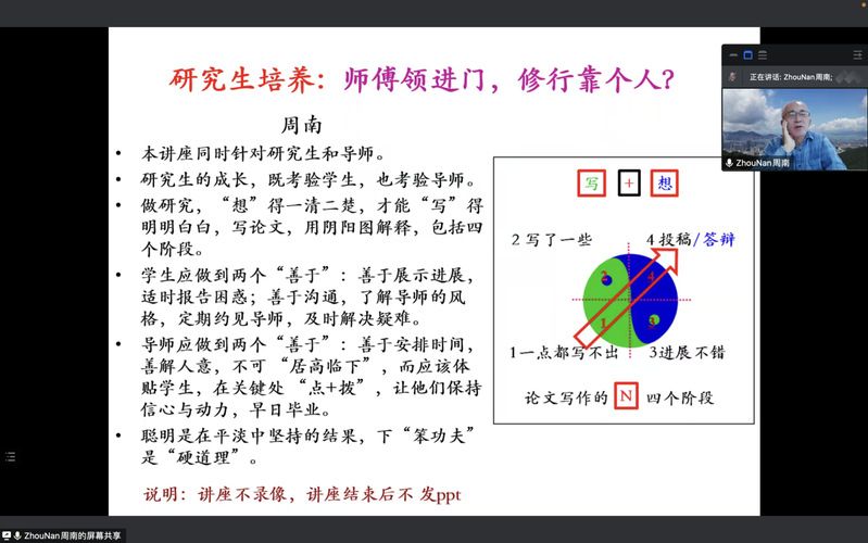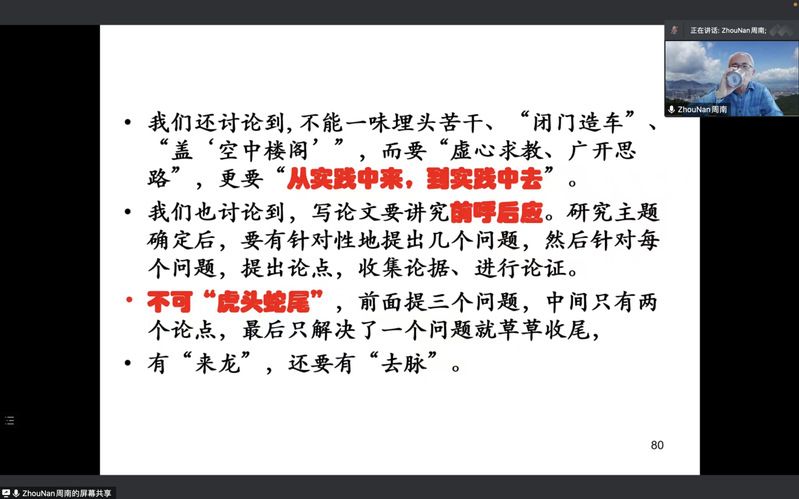 在谈到学生常问的“论文写不出来,该怎么办?”的困惑方面,周教授用通俗易懂的方式将“论文写不出来”困境划分为三类情况,分别是“论文一点都写不出来”、“写来写去却没有把握”和“论文进展不错,但有些问题没太想明白”。针对三类问题依次进行分析讨论,结合众多导师的观点与建议,告诫同学们论文写作靠的是“有心,用心,细心”,好论文不是“写出来的”,而是“想出来的”和“改出来的”,强调要“先想后写,多想多写,想得一清二楚,写得明明白白”。