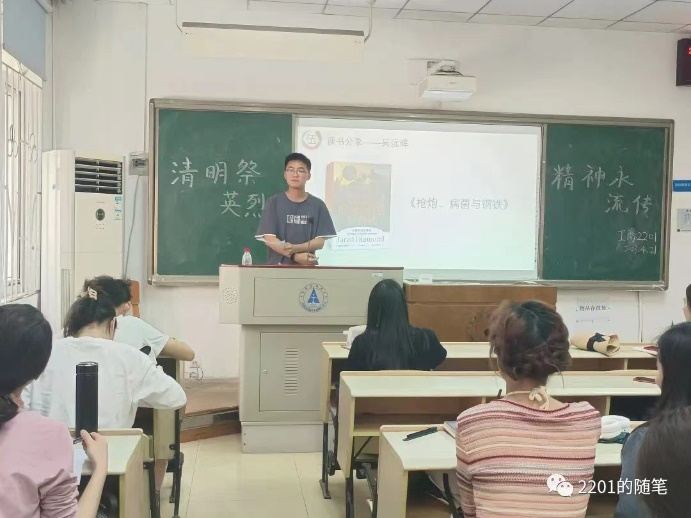 在此后的读书分享会上,周佳、吴远辉同学分别向同学们推荐了《活着》《枪炮、病菌与钢铁》这两本书。两位同学都简要而生动地概括了各自推荐书目的内容,并从书目传达出的主旨思想中延伸出自己独特的思考和见解,结合现实,阐释发人深省的观点,鼓励同学们多读书,读好书,用书籍提升自我的思想素质。
