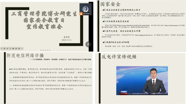 2023年4月14日,工商管理学院全体博士研究生通过线上腾讯会议举行了一场班会,本次班会由姜倩倩老师主讲,旨在宣传消防安全和国家安全相关知识并进行防范电信网络诈骗主题教育。此次班会提高了广大师生的安全意识,也增强国家安全宣传教育的有效性和广泛性,并呼吁同学们为维护国家安全和社会稳定做出应有的贡献。