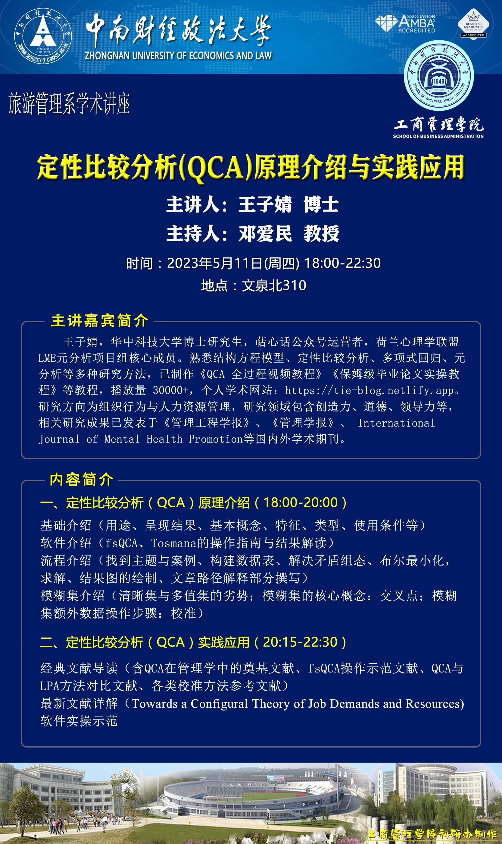 时间地点主办单位主持人主讲人主题2023.5.1118:00-20:0020:15-22:30文泉北310旅游管理系邓爱民 教授王子婧 博士讲座一:定性比较分析(QCA)原理讲座二:定性比较分析(QCA)实践应用