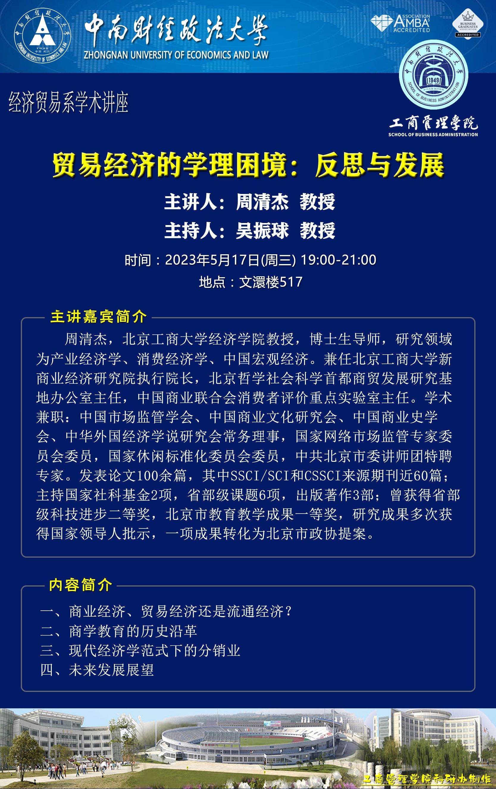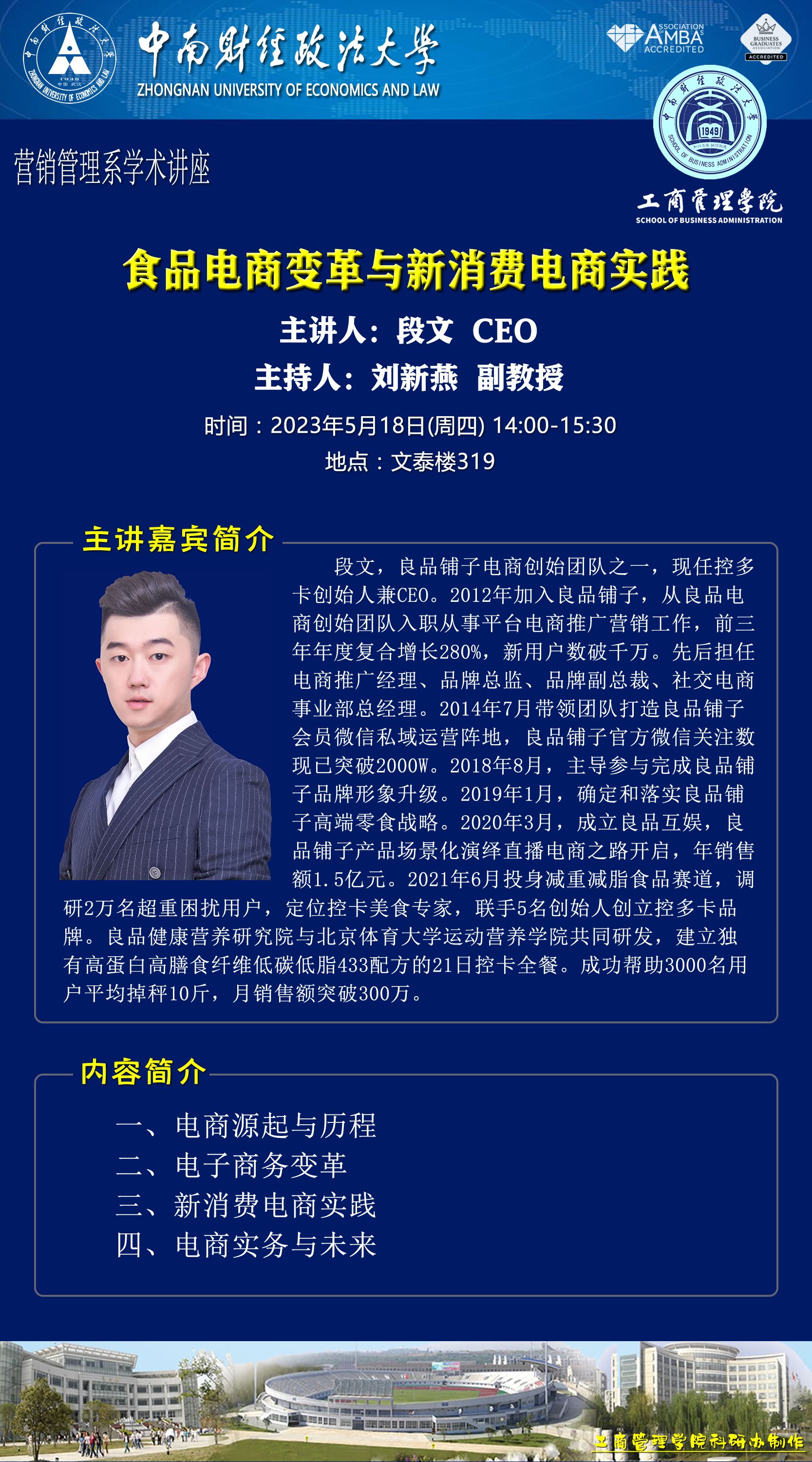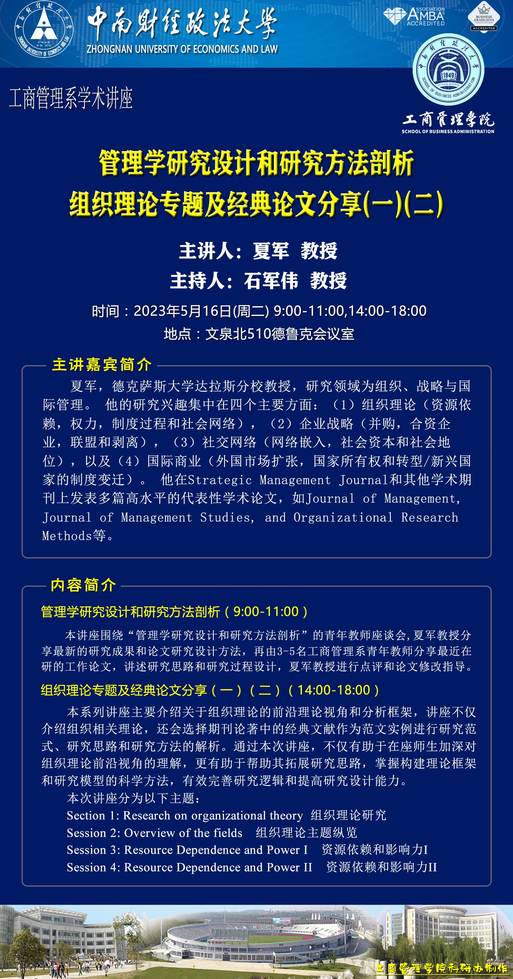 时间地点主办单位主持人主讲人主题2023.5.169:00-11:00,14:00-18:00文泉北楼510德鲁克会议室工商管理系石军伟 教授夏军 教授讲座一:管理学研究设计和研究方法剖析讲座二:组织理论专题及经典论文分享(一)(二)2023.5.17 19:00-21:00文澴楼517经济贸易系吴振球 教授周清杰 教授贸易经济的学理困境:反思与发展2023.5.18 14:00-15:30文泰319营销管理系刘新燕 副教授段文 CEO食品电商变革与新消费电商实践