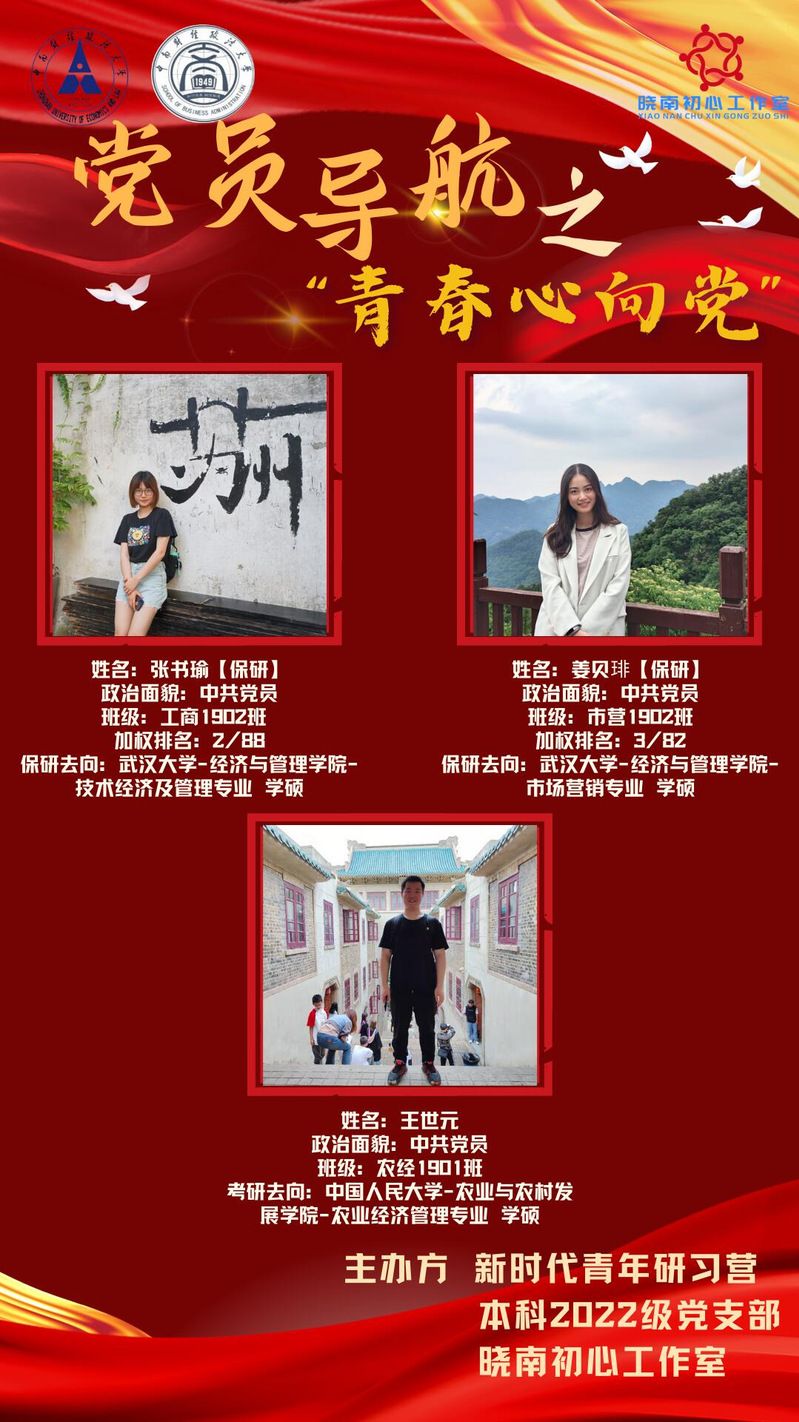 (通讯员田安)为充分发挥学生党员的朋辈互助作用,落实学院本科生党总支“亮身份、明责任、寻初心、践使命”行动计划,拓宽大一学生的视野,激励其完善对大学生活的规划,提升学习技能,提高学习效率,本科生2022级党支部于5月20日下午在文瀚楼403开展“党员导航”活动,工商1902班张书瑜、市营1902班姜贝琲、农经1901班王世元受邀分享大学期间的学习和学生工作经验。