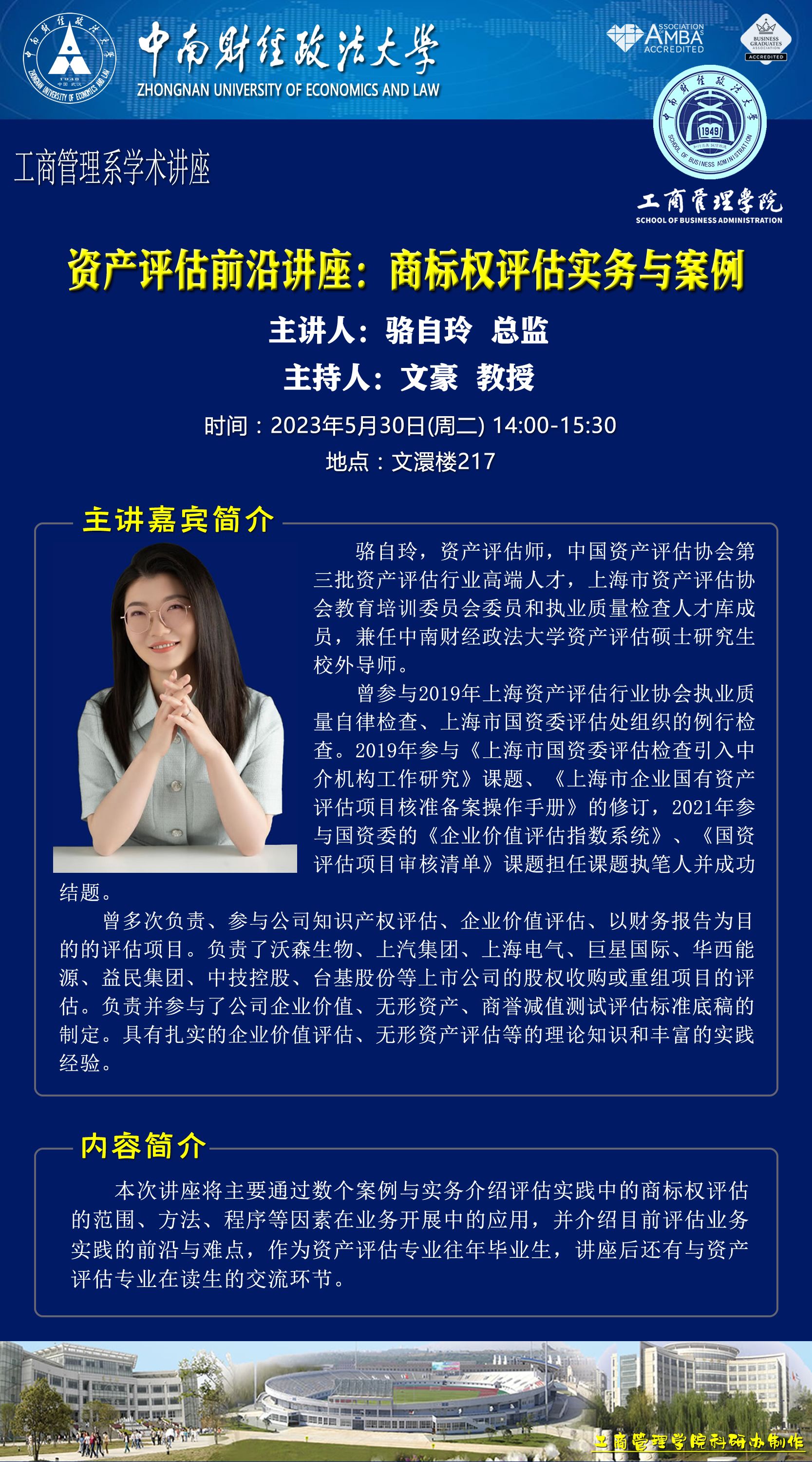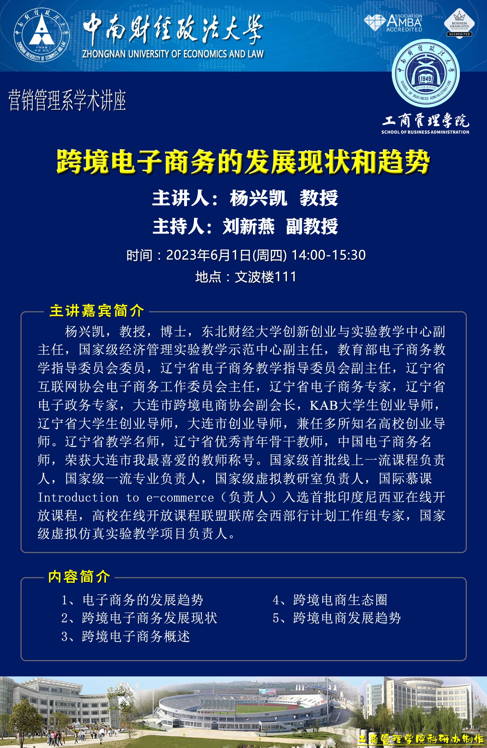 时间地点主办单位主持人主讲人主题2023.5.30 14:00-15:30文澴楼217工商管理系文豪 教授骆自玲 总监资产评估前沿讲座:商标权评估实务与案例2023.5.30 18:00-22:30文泉北楼510德鲁克会议室旅游管理系桂橙林 博士赵旭宏 博士 扎根研究:定性研究实践指南理论基础(18:00-20:00),实践与应用(20:15-22:30)2023.6.1 14:00-15:30文波楼111营销管理系刘新燕 副教授杨兴凯 教授跨境电子商务的发展现状和趋势