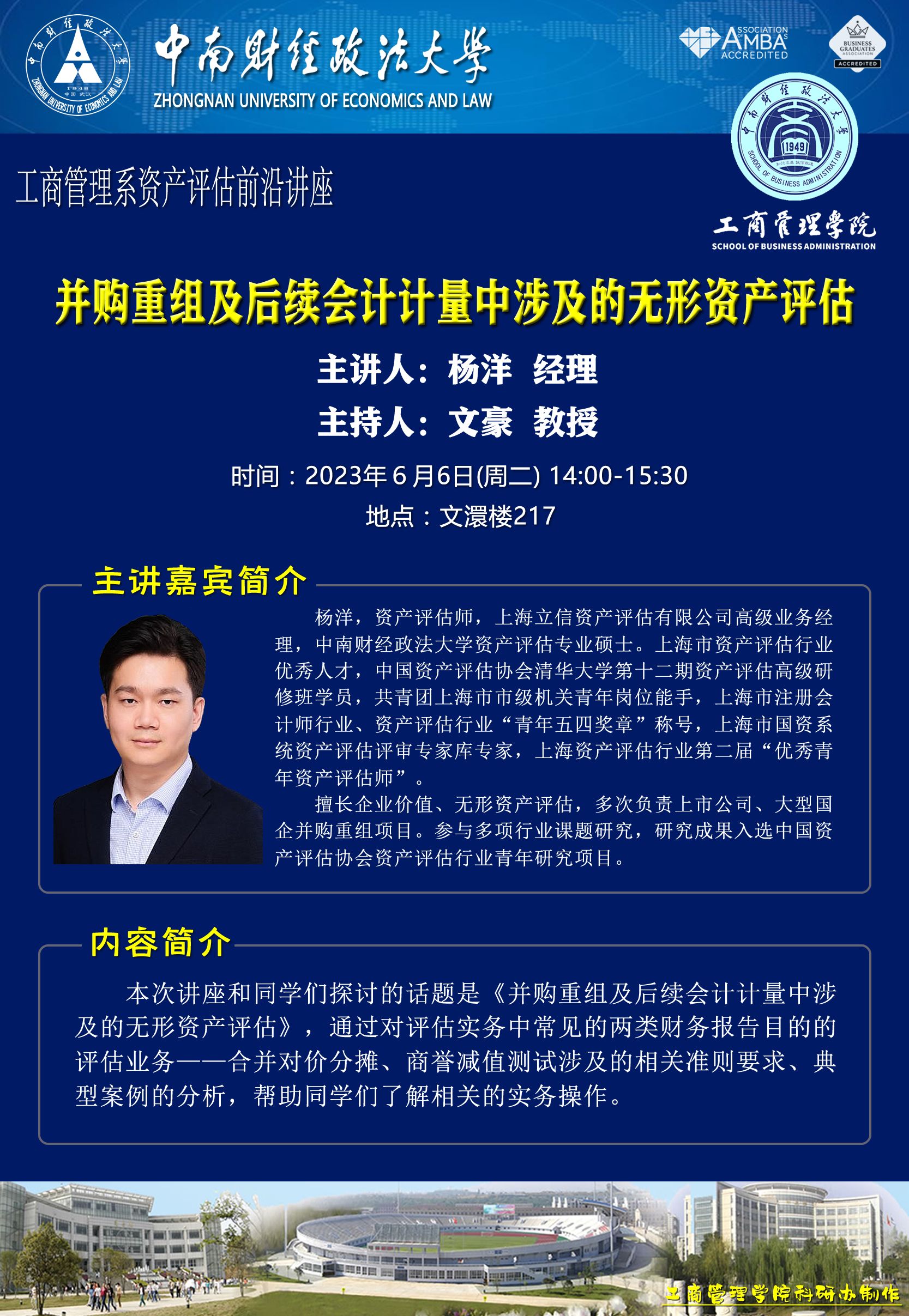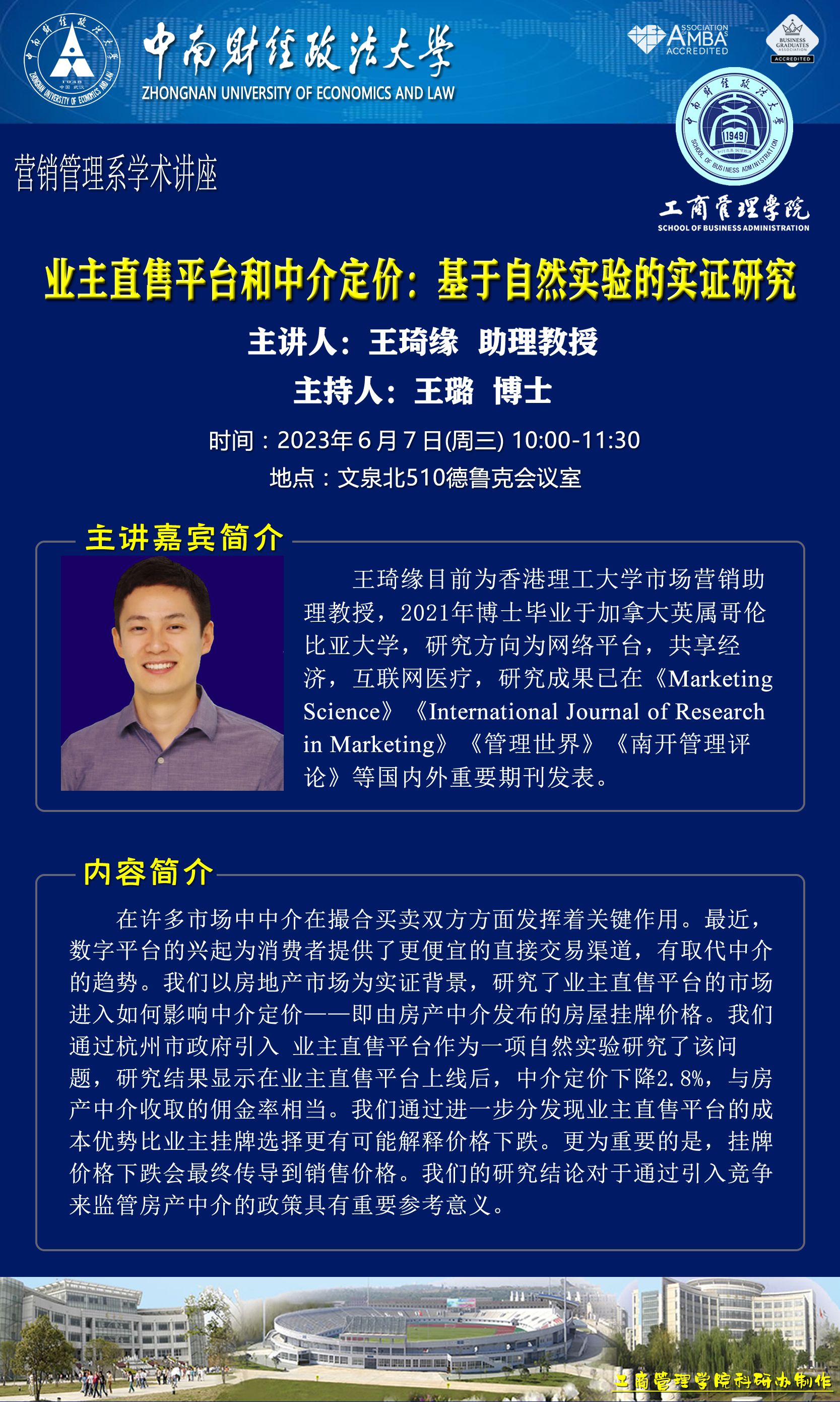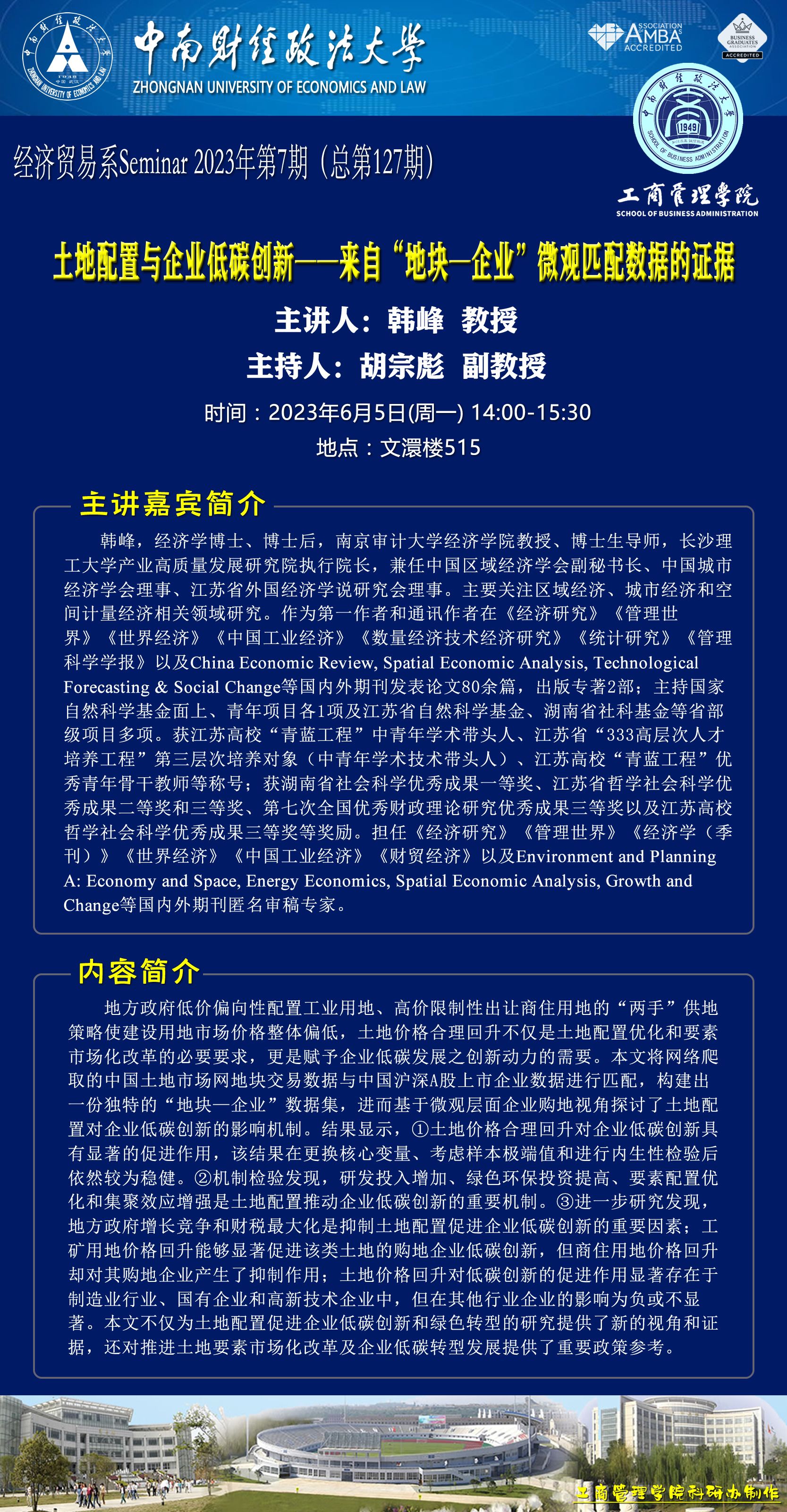 时间地点主办单位主持人主讲人主题2023.6.5 14:00-15:30文澴楼515经济贸易系胡宗彪 副教授韩峰 教授土地配置与企业低碳创新——来自“地块—企业”微观匹配数据的证据2023.6.6 14:00-15:30文澴楼217工商管理系文豪 教授杨洋 经理并购重组及后续会计计量中涉及的无形资产评估2023.6.7 10:00-11:30文泉北407会议室(地点更改)营销管理系王璐 博士王琦缘 助理教授业主直售平台和中介定价:基于自然实验的实证研究