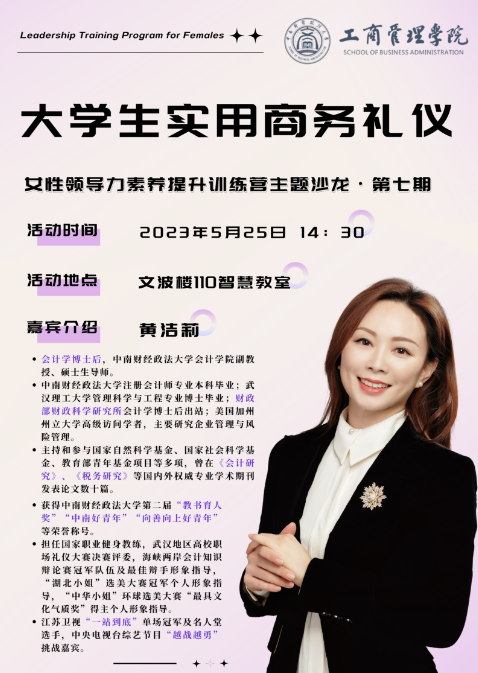 (通讯员蔡冬丽)2023年5月25日下午,米兰电竞·(中国区)女性领导力素养提升训练营第七期主题沙龙在文波楼110智慧教室举行。本期沙龙以“大学生实用商务礼仪”为主题,由米兰电竞·(中国区)会计学院副老师黄洁莉主讲,工商管理学院辅导员刘筱佳老师主持本次活动。