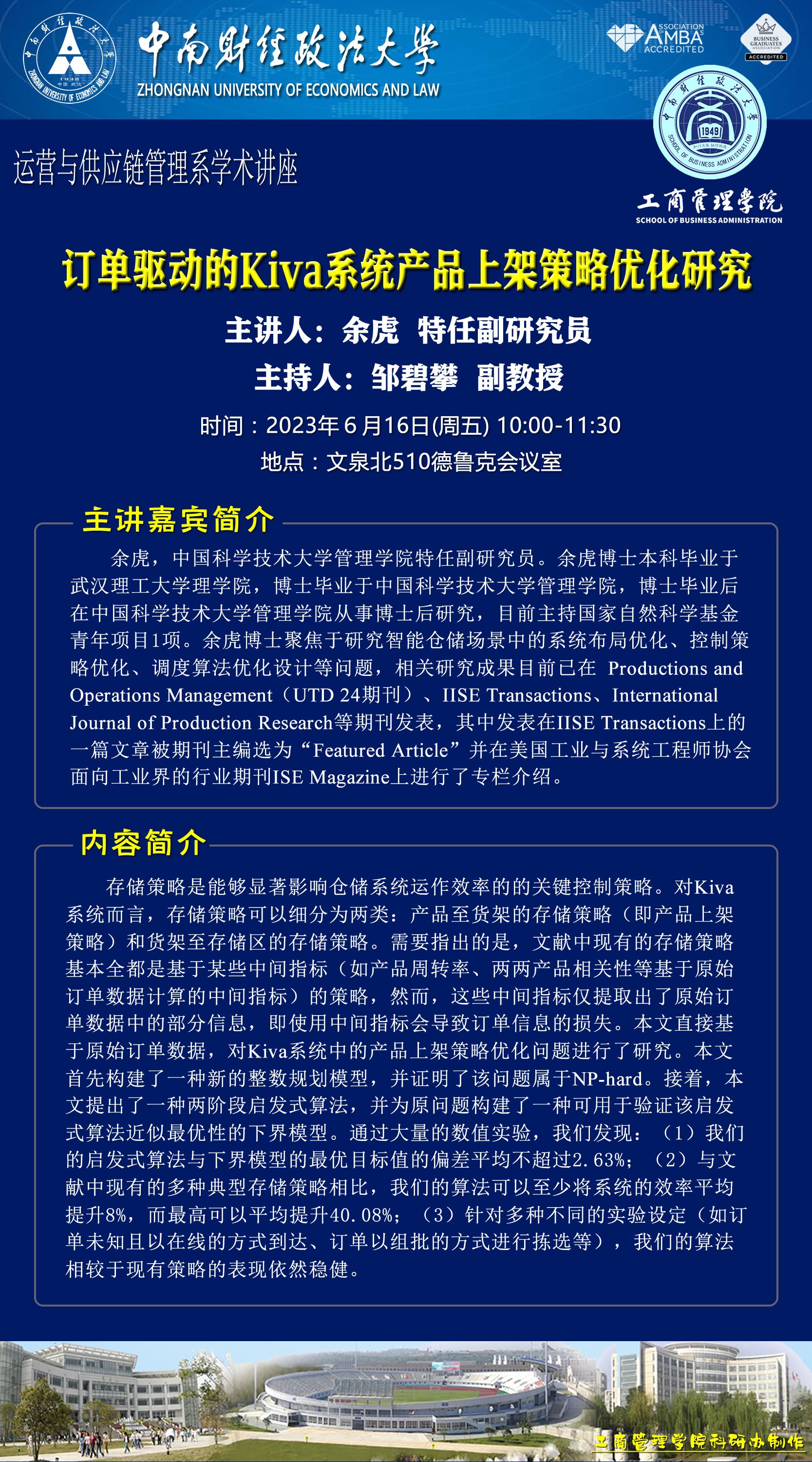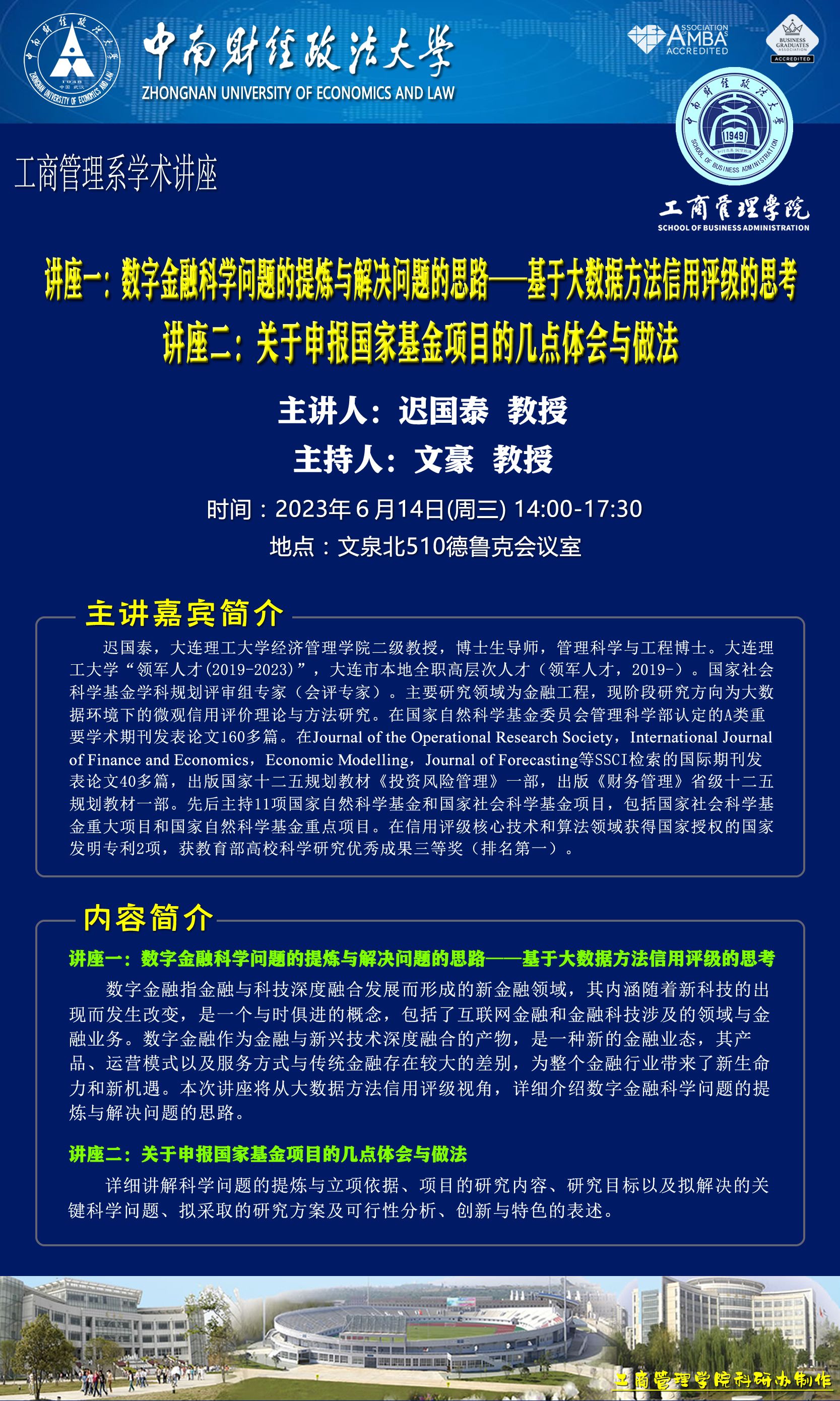 时间地点主办单位主持人主讲人主题2023.6.14 14:00-17:30文泉北510德鲁克会议室工商管理系文豪 教授迟国泰 教授讲座一:数字金融科学问题的提炼与解决问题的思路——基于大数据方法信用评级的思考讲座二:关于申报国家基金项目的几点体会与做法2023.6.16 10:00-11:30文泉北510德鲁克会议室运营与供应链管理系邹碧攀 副教授余虎 特任副研究员订单驱动的Kiva系统产品上架策略优化研究