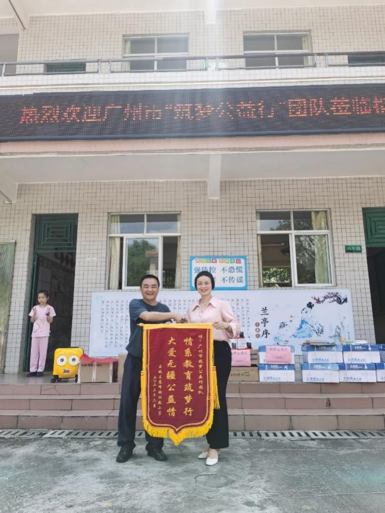 洞殿小学李建云校长向筑梦公益行发起人MBA2015级校友蓝曼赠送锦旗
