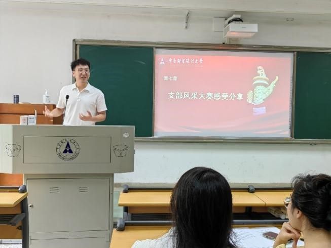同时,也有五名同学上台分享了自己在本次支部风采大赛中心得感悟。傅婉清同学回忆了协助主讲人陆宇涵准备党课文稿的过程,讲述了深入学习党的二十大精神的收获及体会。无论是作为参赛队员还是幕后工作人员,此次比赛都让自己对党组织有了新的认识和体会。陈泽敏同学作为参加知识竞答环节的代表,回顾了整个备赛过程,她与参赛搭档钱莹飞同学扎实复习党史党章及二十大报告等相关内容,通过提问互答的方式检验学习效果。支部成员齐心协力,通过接力陪练的方式帮助他们巩固知识点。刘馨忆同学回顾自己参加风采展示的经历,她表示,成员的默契配合及舞蹈的整齐划一,既离不开负责同学的耐心指导,也离不开各位同学的坚持不懈,是大家共同把支部建设得越来越美好。毛行达同学则表示,作为幕后工作人员,比赛有序进行、大家的高兴和信任是对他工作最大的回报,他为支部感到骄傲自豪。苏思盈同学作为剧本创作者,叙述了克服剧本创作的不易,也很高兴看到优秀影片的呈现,自己虽只注入小小力量,却收获了大大回报,感到无比光荣和自豪。