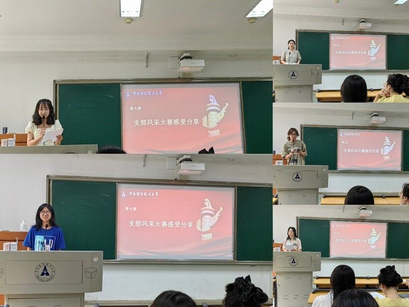 同时,也有五名同学上台分享了自己在本次支部风采大赛中心得感悟。傅婉清同学回忆了协助主讲人陆宇涵准备党课文稿的过程,讲述了深入学习党的二十大精神的收获及体会。无论是作为参赛队员还是幕后工作人员,此次比赛都让自己对党组织有了新的认识和体会。陈泽敏同学作为参加知识竞答环节的代表,回顾了整个备赛过程,她与参赛搭档钱莹飞同学扎实复习党史党章及二十大报告等相关内容,通过提问互答的方式检验学习效果。支部成员齐心协力,通过接力陪练的方式帮助他们巩固知识点。刘馨忆同学回顾自己参加风采展示的经历,她表示,成员的默契配合及舞蹈的整齐划一,既离不开负责同学的耐心指导,也离不开各位同学的坚持不懈,是大家共同把支部建设得越来越美好。毛行达同学则表示,作为幕后工作人员,比赛有序进行、大家的高兴和信任是对他工作最大的回报,他为支部感到骄傲自豪。苏思盈同学作为剧本创作者,叙述了克服剧本创作的不易,也很高兴看到优秀影片的呈现,自己虽只注入小小力量,却收获了大大回报,感到无比光荣和自豪。