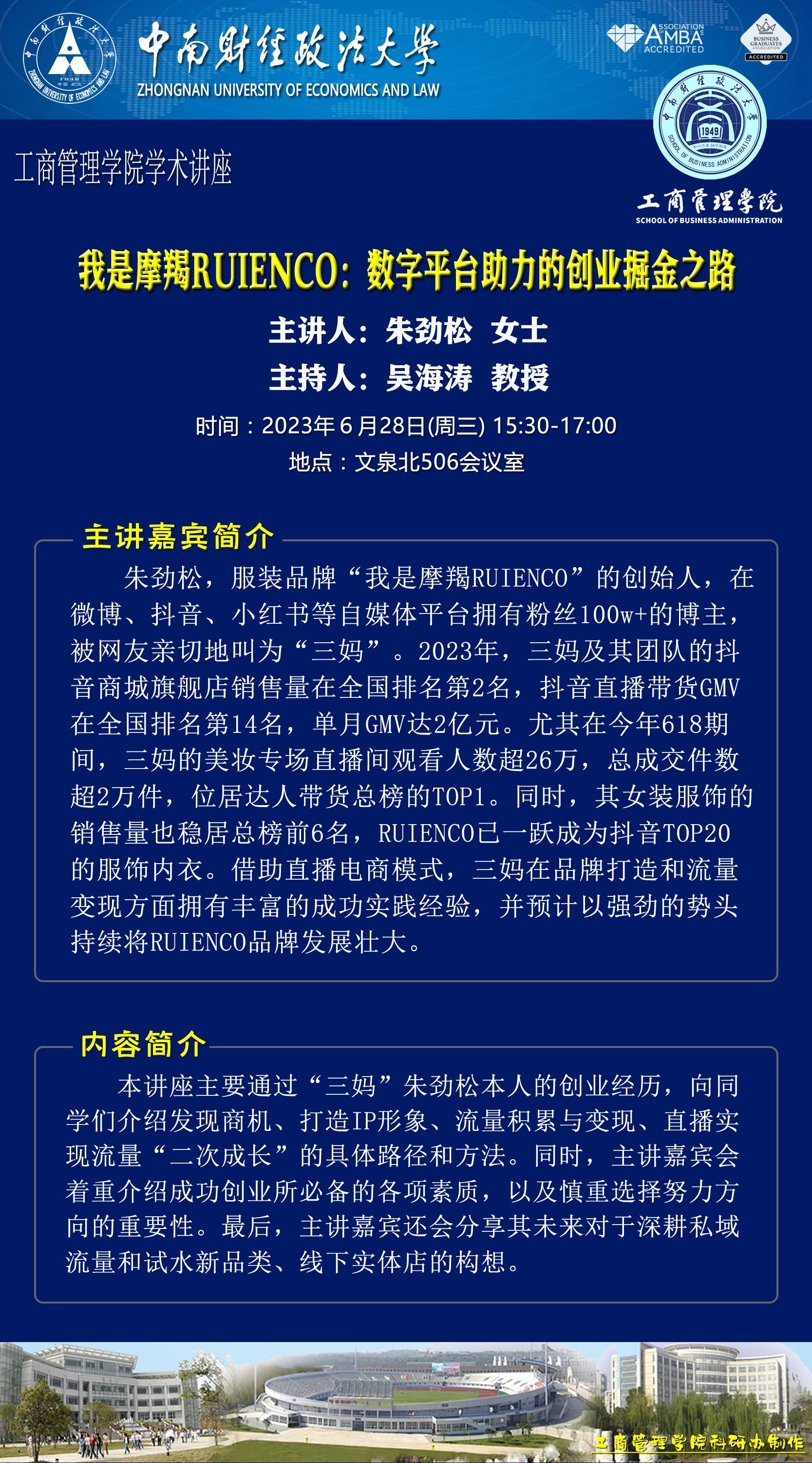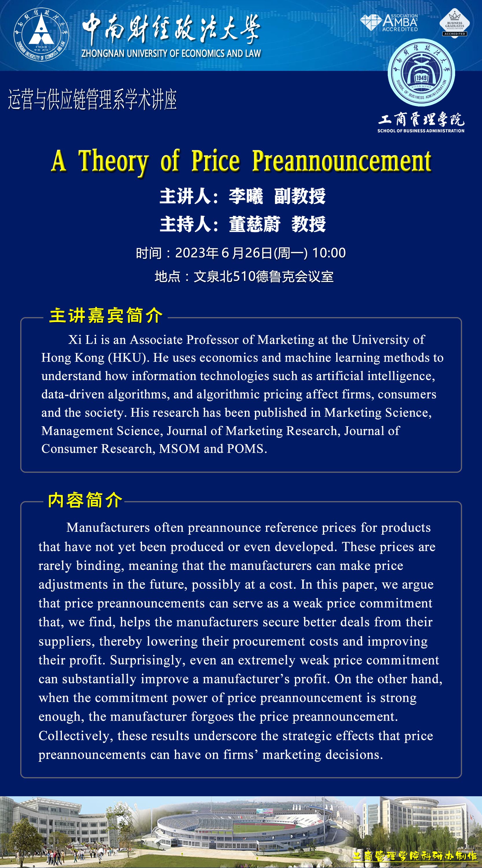 时间地点主办单位主持人主讲人主题2023.6.26 10:00文泉北510德鲁克会议室运营与供应链管理系董慈蔚 教授李曦 副教授A Theory of Price Preannouncement2023.6.28 15:30-17:00文泉北506会议室工商管理学院吴海涛 教授朱劲松 女士我是摩羯 RUIENCO:数字平台助力的创业掘金之路