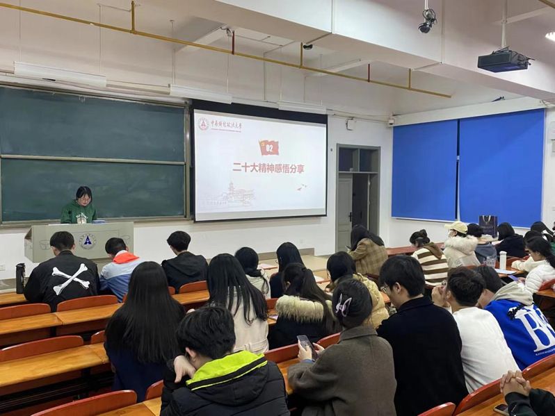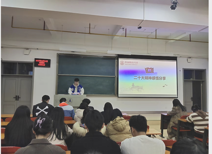 首先是贸经2001班班长朱奇作为领学人给全体同学讲述学习党的二十大精神的重大意义,从时代发展、伟大目标、四个自信等角度进行生动阐述;之后对于二十大精神框架具体内容从9个方面进行深刻领会,最后带动全体同学从时代青年的身份出发,呼吁争做有理想、有担当、肯奋斗的青年。