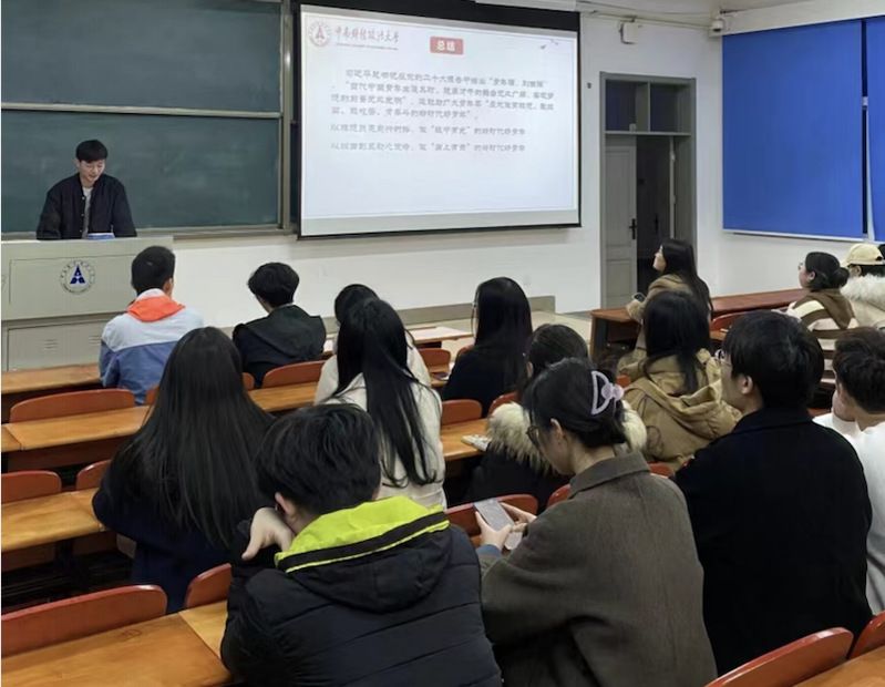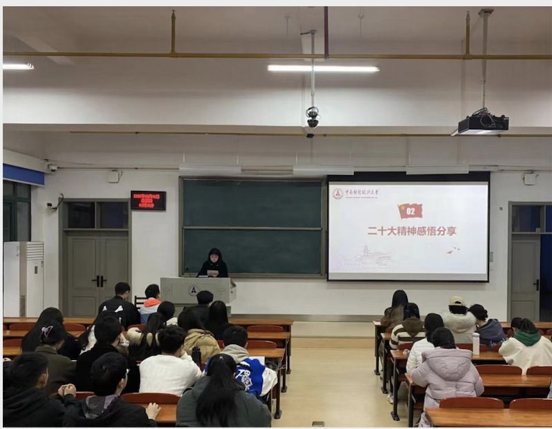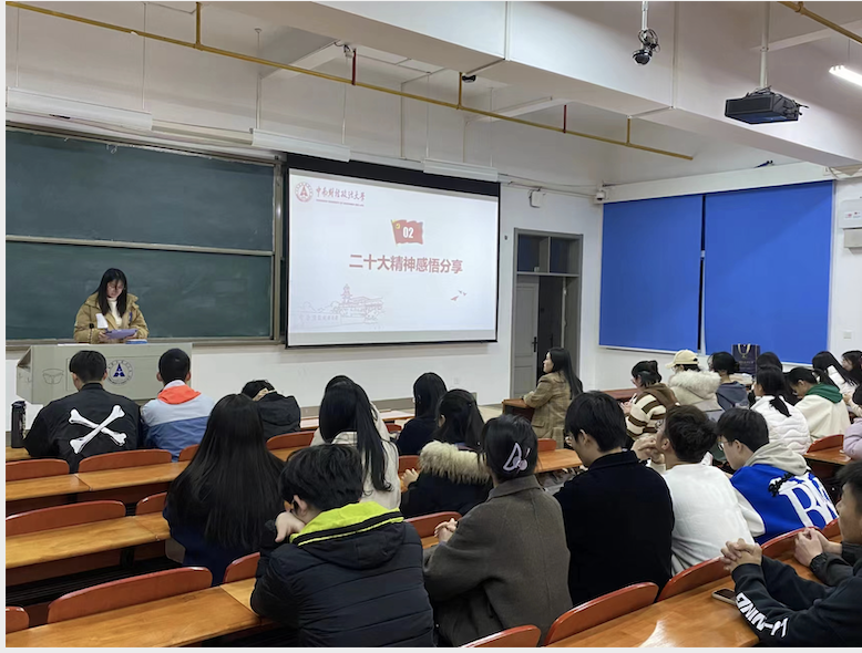 然后三个班的积极分子和优秀同学进行了二十大感悟分享。人力1班许钰婷同学在学习二十大精神时,感受到时代青年的重大使命感和责任感;人力1班袁语瞳同学深入学习二十大精神,坚定跟党走的理想信念;人力2班团支书张金燕同志结合自身实际,谈到学习二十大后带来的思想和生活的变化;人力2班苏清梅同学重点提到学习二十大后自身进行了更多相关理论的学习;贸经1班张中娟同学就理论学习方面不断深入,认识深刻;贸经1班党员吴意同志时刻谨记自身党员荣誉身份,不断学习理论知识同时结合自身实际,为全体同学做一个榜样。6名同学积极表达自身对于二十大的感悟,不同角度不同程度地表达对于党的二十大的时刻关注和学习领悟。