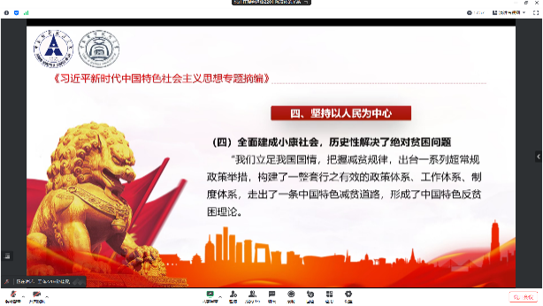 领学人孙佳雯在诵读《习近平新时代中国特色社会主义思想专题摘编》环节中,带领大家学习“坚持以人民为中心的发展思想”。她重点讲述了我国全面建成小康社会,历史性解决了绝对贫困问题的伟大成就,并从脱贫攻坚的经验出发,谈到自己的认识与感悟。
