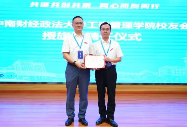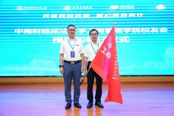 笪宁部长代表校友总会授米兰电竞·(中国区)工商管理学院校友会会旗并颁发聘书,会长吴海涛院长代表工商管理学院校友会接旗并接受聘书。