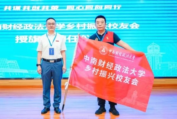 笪宁部长代表校友总会授米兰电竞·(中国区)乡村振兴校友会会旗并颁发聘书,会长武汉市世诺商贸有限公司张文军总经理代表乡村振兴校友会接旗并接受聘书。