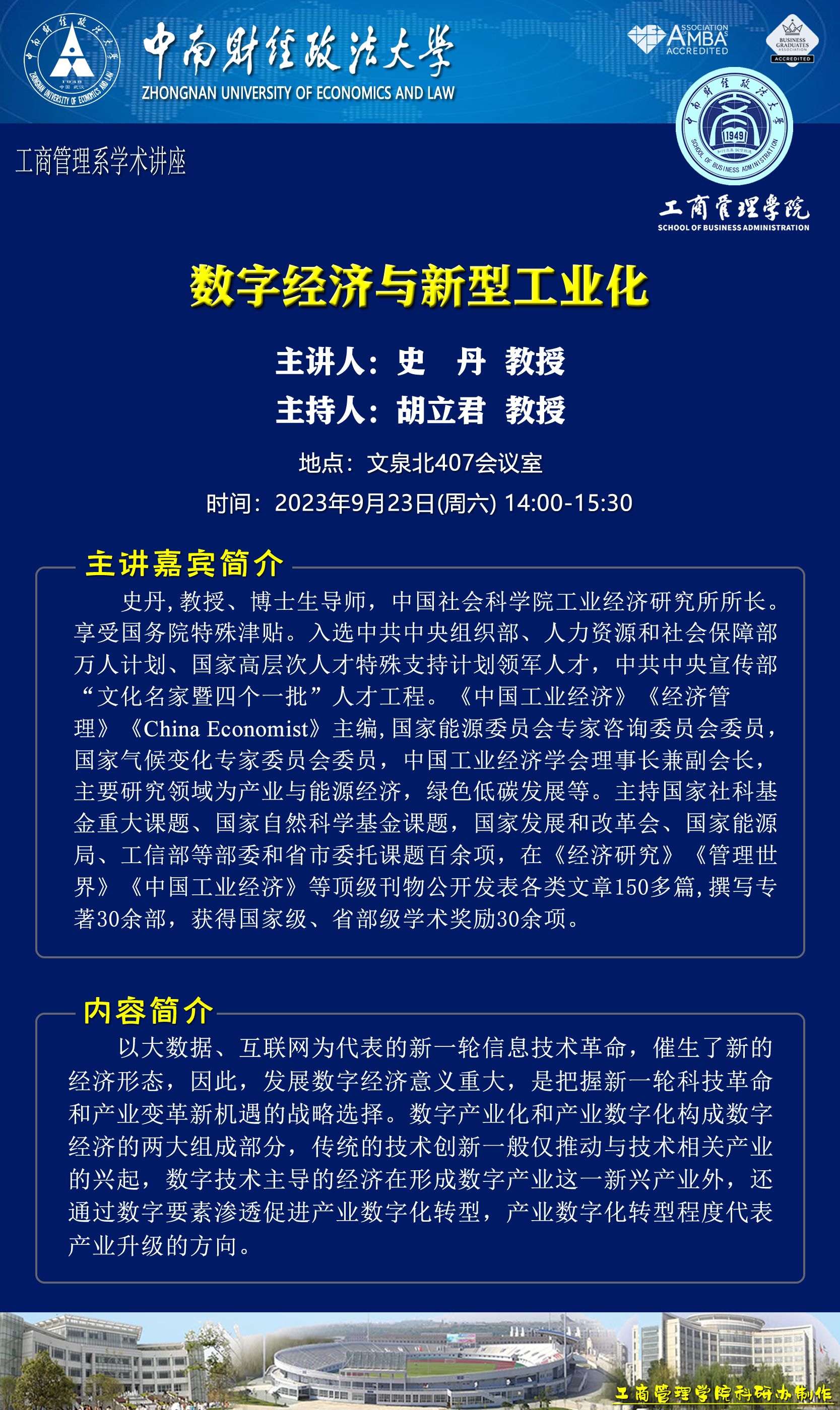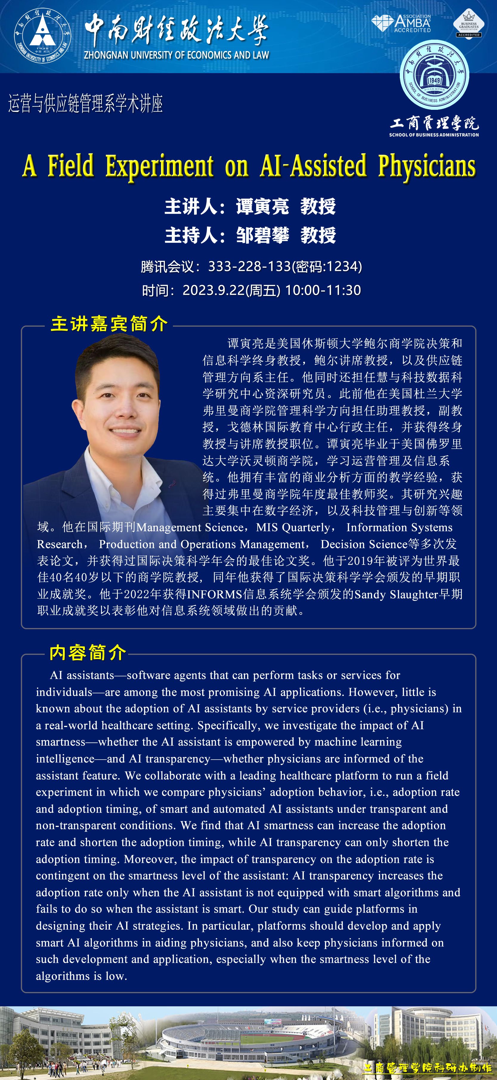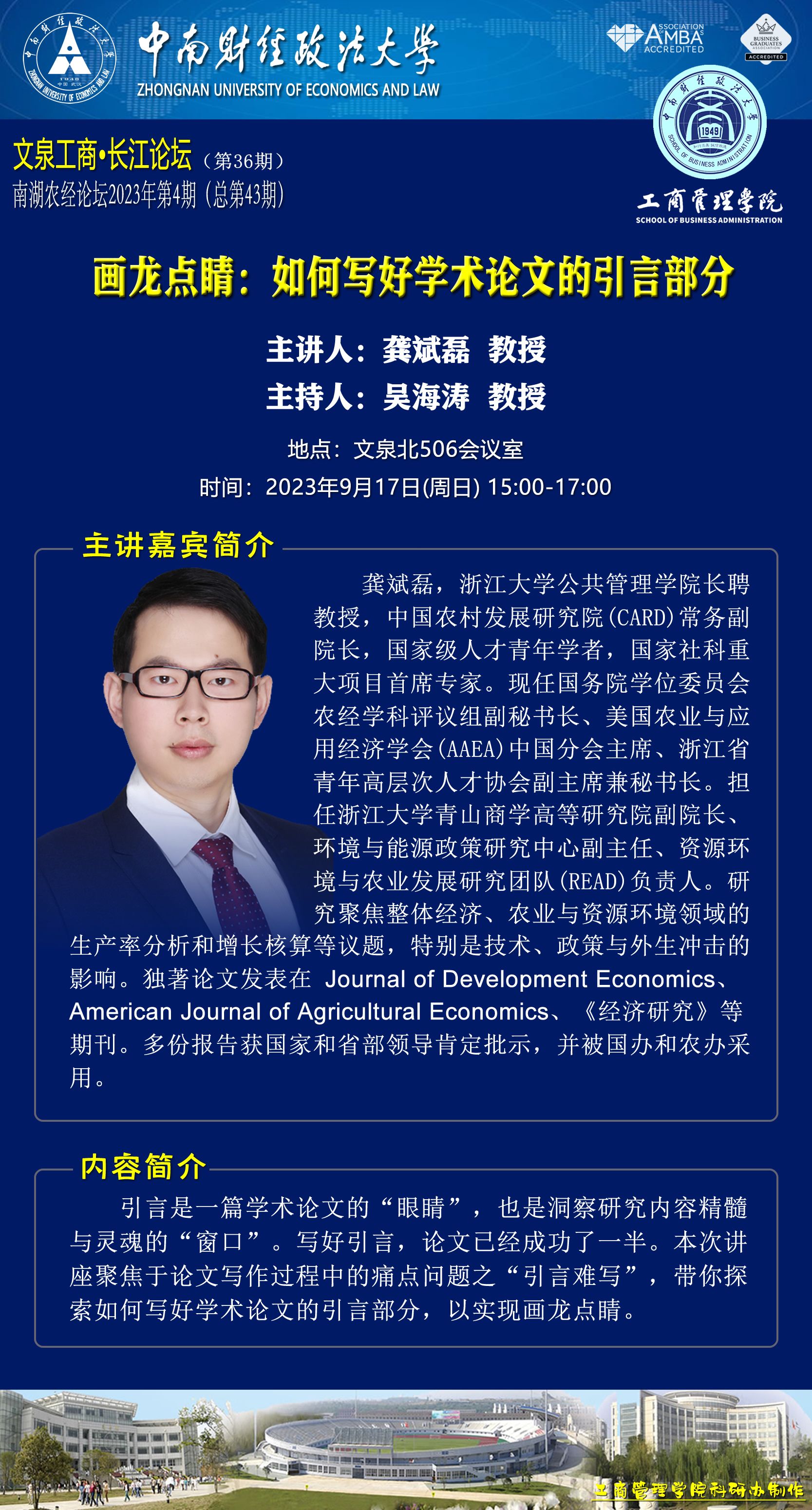 时间地点主办单位主持人主讲人主题2023.9.17 15:00-17:00文泉北楼506会议室文泉工商•长江论坛农业经济管理系吴海涛 教授龚斌磊 教授画龙点睛:如何写好学术论文的引言部分2023.9.18 8:50-10:10文泉北楼407会议室MBA教育中心、管理案例研究中心、数字经济与商业伦理研究中心文豪 教授崔淼 教授单案例研究的设计与实施2023.9.18 14:00-15:30文泉北楼506会议室郑耀洲 副教授余惠勇 董事长九死一生话商道——百果园文化变革与企业发展案例2023.9.18 14:00-15:30文添楼201工商管理系文豪 教授王诚军 董事长资产评估行业的前世与今生:来自评估人的观察与思考2023.9.22 10:00-11:30腾讯会议:333-228-133(参与密码:1234)运营与供应链管理系邹碧攀 教授谭寅亮 教授A Field Experiment on AI-Assisted Physicians2023.9.22 18:30-20:00地点变更至:环湖倍阅书店经济贸易系吴英娜 副教授刘卫国 合伙人人生剧本的中南大篇章——底气何来,梦想何在,幸福何往2023.9.23 14:00-15:30文泉北407会议室工商管理系胡立君 教授史丹 教授数字经济与新型工业化2023.9.23 15:30-17:00文泉北407会议室工商管理系石军伟 教授陶锋 教授科技创新与产业集群——粤港澳大湾区为例