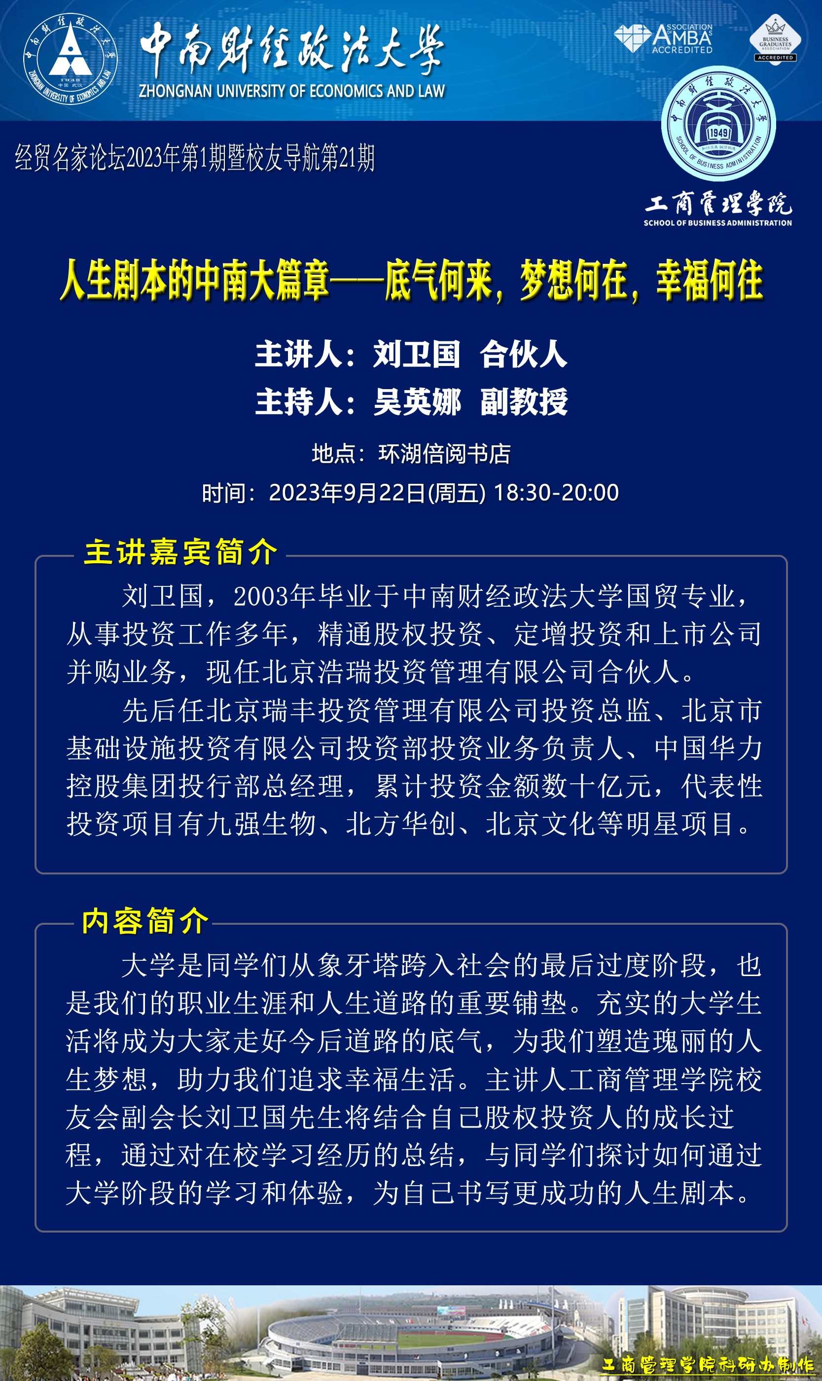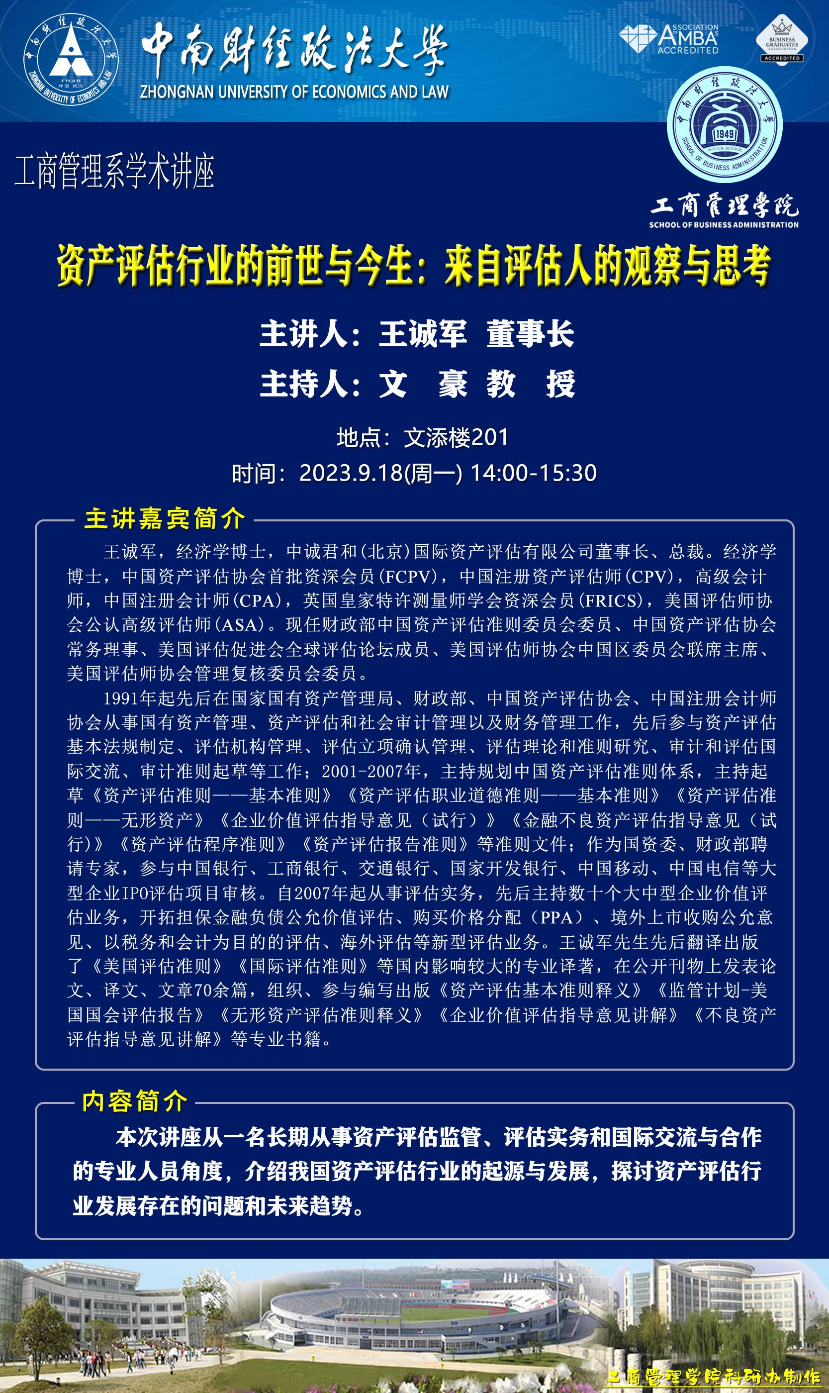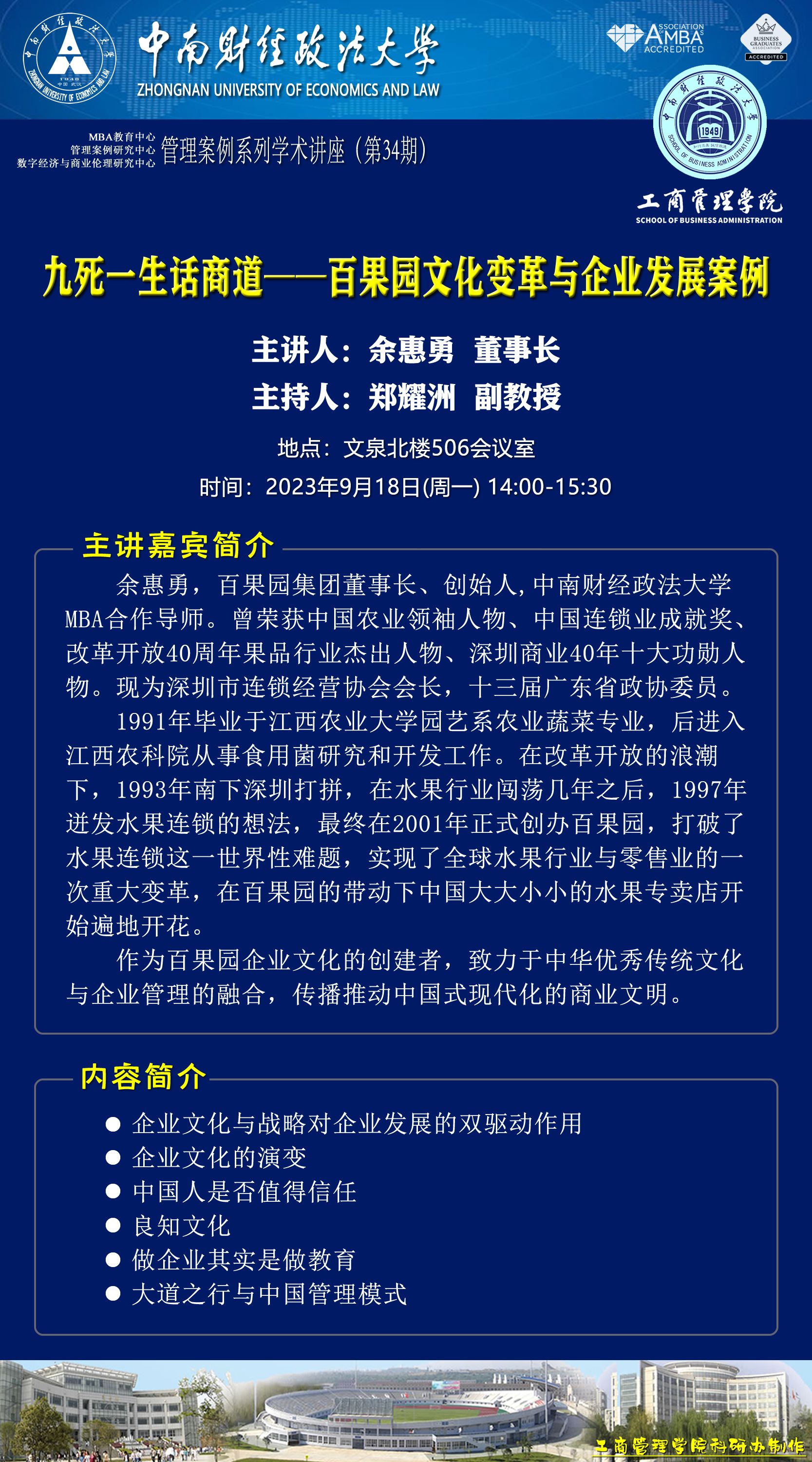 时间地点主办单位主持人主讲人主题2023.9.17 15:00-17:00文泉北楼506会议室文泉工商•长江论坛农业经济管理系吴海涛 教授龚斌磊 教授画龙点睛:如何写好学术论文的引言部分2023.9.18 8:50-10:10文泉北楼407会议室MBA教育中心、管理案例研究中心、数字经济与商业伦理研究中心文豪 教授崔淼 教授单案例研究的设计与实施2023.9.18 14:00-15:30文泉北楼506会议室郑耀洲 副教授余惠勇 董事长九死一生话商道——百果园文化变革与企业发展案例2023.9.18 14:00-15:30文添楼201工商管理系文豪 教授王诚军 董事长资产评估行业的前世与今生:来自评估人的观察与思考2023.9.22 10:00-11:30腾讯会议:333-228-133(参与密码:1234)运营与供应链管理系邹碧攀 教授谭寅亮 教授A Field Experiment on AI-Assisted Physicians2023.9.22 18:30-20:00地点变更至:环湖倍阅书店经济贸易系吴英娜 副教授刘卫国 合伙人人生剧本的中南大篇章——底气何来,梦想何在,幸福何往2023.9.23 14:00-15:30文泉北407会议室工商管理系胡立君 教授史丹 教授数字经济与新型工业化2023.9.23 15:30-17:00文泉北407会议室工商管理系石军伟 教授陶锋 教授科技创新与产业集群——粤港澳大湾区为例