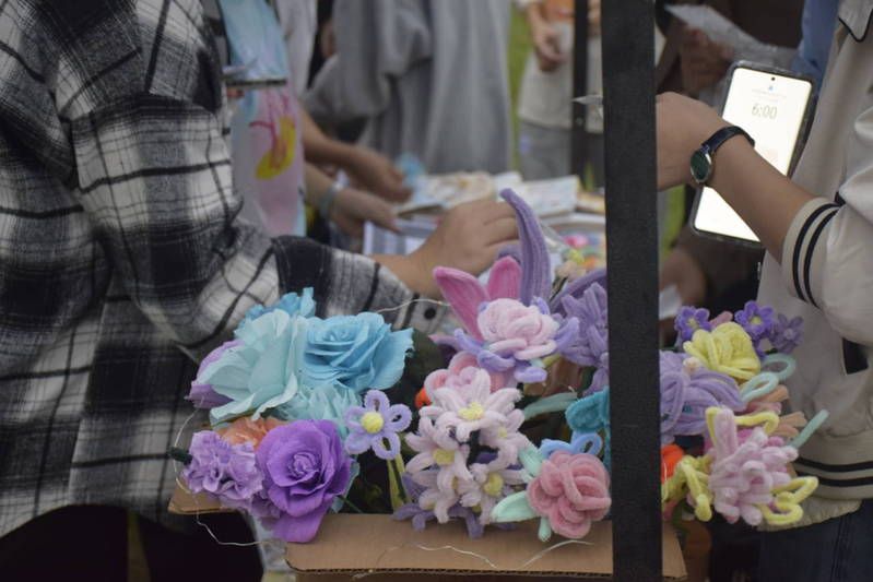 临近酉时,志愿者们满怀期盼布置好活动现场,摊位上款式新颖的毛绒发卡,非遗钩针手法编织出的永生花,是手创协会志愿者们精心制作的手工艺品;印染着优秀文创作品的挎包,摹印着娟秀图案的团扇,是工商志协精心挑选的定制商品。不料斜风欲来雨频催,万里无云的天空临时落雨,导致所有物资都面临着淋湿的风险。