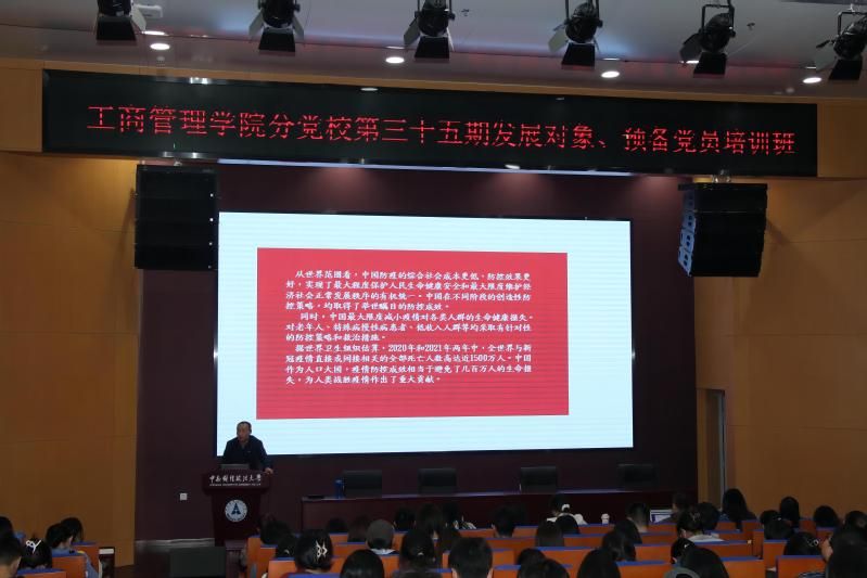 开班典礼结束后,余小朋书记为入党积极分子培训班讲授第一课:题为《中国共产党的光辉历程——新民主主义革命时期的奋斗历程及启示》,从四个方面:中国共产党应运而生、两次胜利与两次失败、从胜利走向胜利、“站起来”的历史启示,来讲述我党在新民主主义革命时期的光辉历程。在余书记的带领下,我们看见一幅刻画中国共产党成长奋斗历程的画卷在眼前徐徐展开,以十月革命为起点,迎接马克思主义的到来,从两次胜利和两次失败中吸取成果、总结教训,从全面抗战与解放战争胜利得到宝贵的成果,也从”站起来”的历史中得到启示。余书记要求同学们以历史为镜,学习党史,汲取前辈们社会主义实践经验,并充分运用到学习工作生活中去。余小朋书记的亲切授课为本次培训做了一个精彩的开头,推动了本次培训的圆满顺利完成。