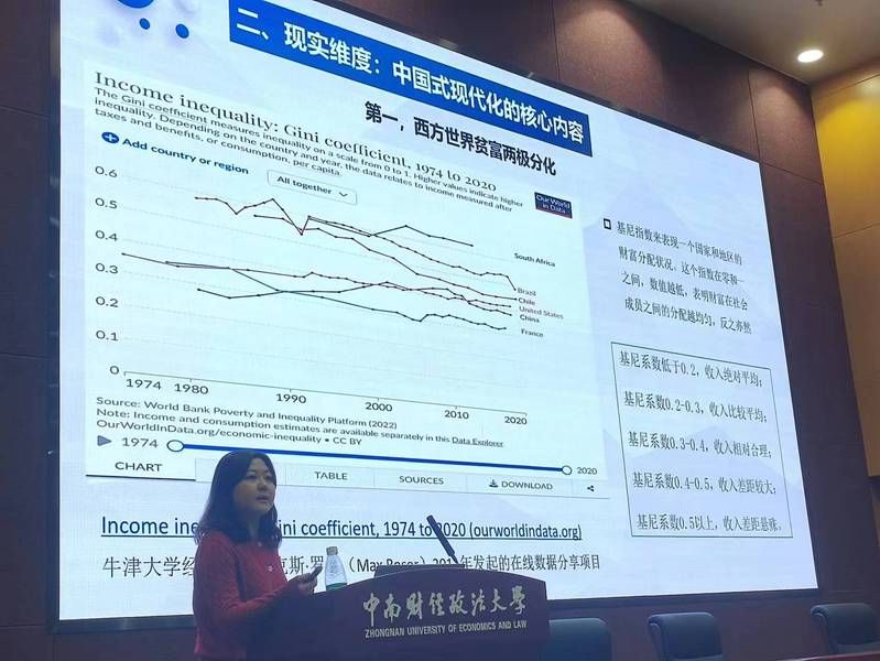 马克思主义学院孙珮云老师以《中国式现代化的发展历程》为题,从新中国成立初期、改革开放时期和社会主义新时代三个阶段为学生们讲述了不同阶段现代化的内容和任务。在此基础上,孙老师要求同学们明确中国式现代化的特征和核心内容,即中国式现代化的核心内容是人口规模巨大的现代化,是全体人民共同富裕的现代化,是物质文明和精神文明相协调的现代化,是人与自然和谐共生的现代化,是走和平发展道路的现代化,体现的历史发展的延续性,符合实践发展的新要求。最后,孙老师向同学们强调:中国式现代化是一场历史的传承,是一场中国共产党领导广大人民群众积极探索的接力赛,鼓励同学们以饱满的热情、秉承求实的作风积极投身于现代化建设中,贡献自己的力量。