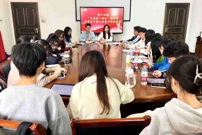 (记者 李娟宇 黄叶晴 摄影 李娟宇)“坚定文化自信秉持开放包容坚持守正创新,为全面全面建设社会主义现代化国家推进中华民族伟大复兴提供坚强思想保证强大精神力量有利文化条件。”10月19日中午,工商管理学院在文泉楼举行第十七期“分层次一体化”培训班团学骨干第二次集中理论学习会。本次会议由分团委书记何强老师主持,团委指导老师杨思琦出席会议。
