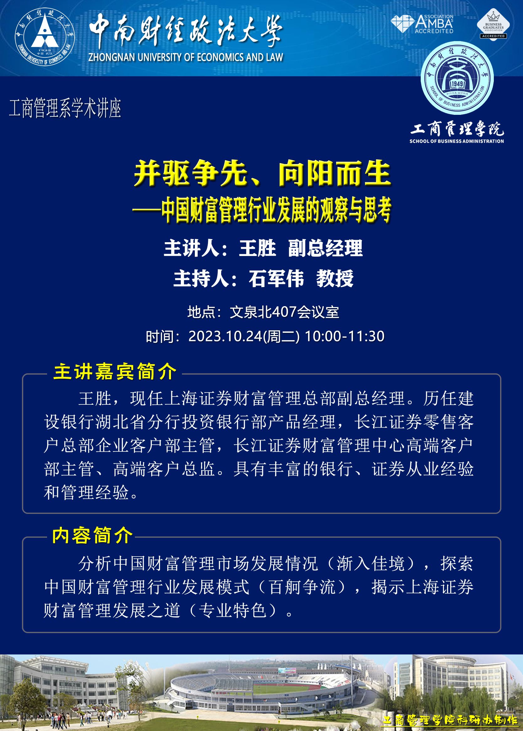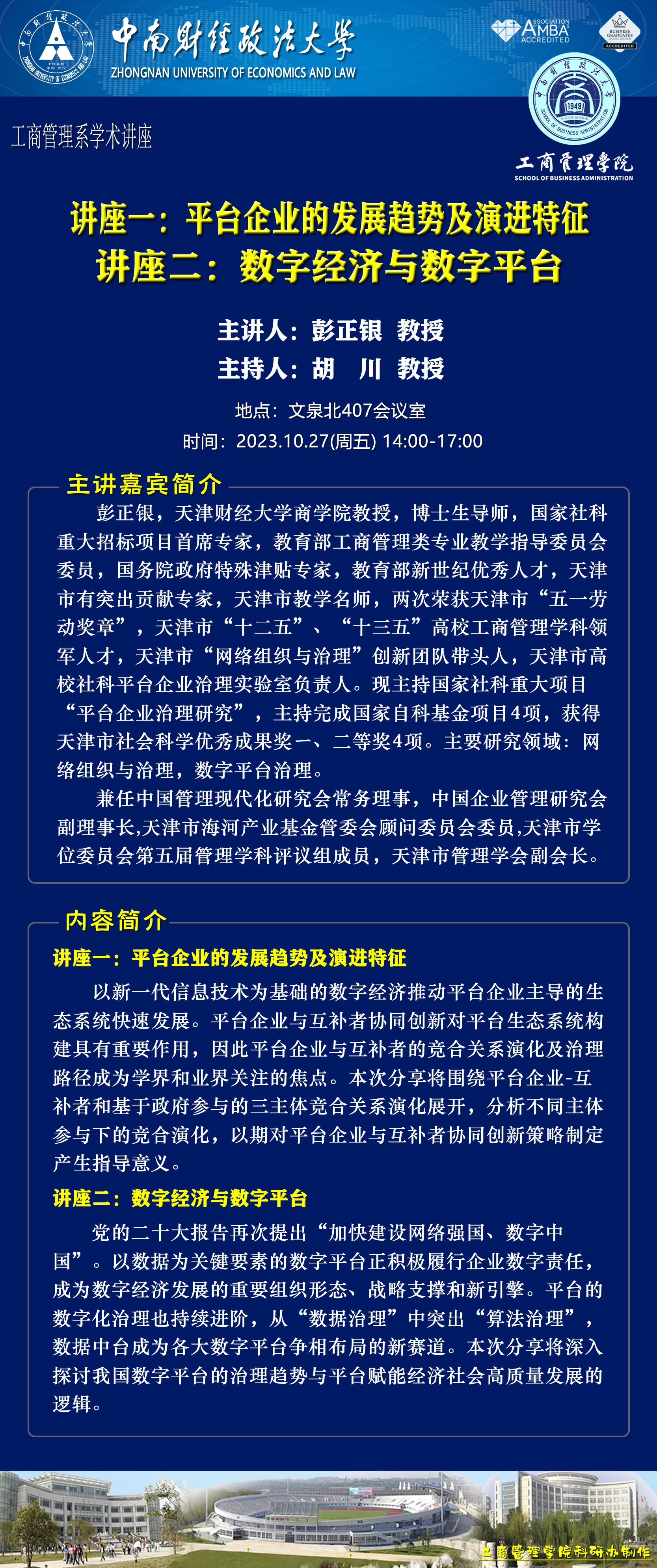 时间地点主办单位主持人主讲人主题2023.10.24 10:00-11:30文泉北407会议室工商管理系石军伟 教授王胜 副总经理并驱争先、向阳而生——中国财富管理行业发展的观察与思考2023.10.27 14:00-16:30文添楼112经济贸易系曹亮 教授吴继忠 副教授中国宏观环境分析与企业新机遇2023.10.27 14:00-17:00文泉北407会议室工商管理系胡川 教授彭正银 教授讲座一:平台企业的发展趋势及演进特征讲座二:数字经济与数字平台