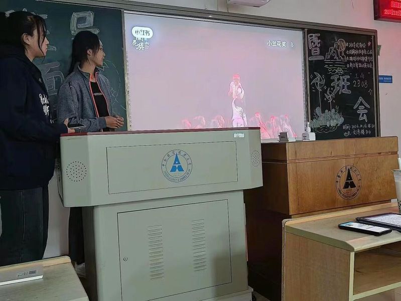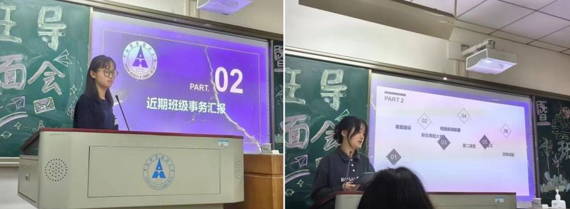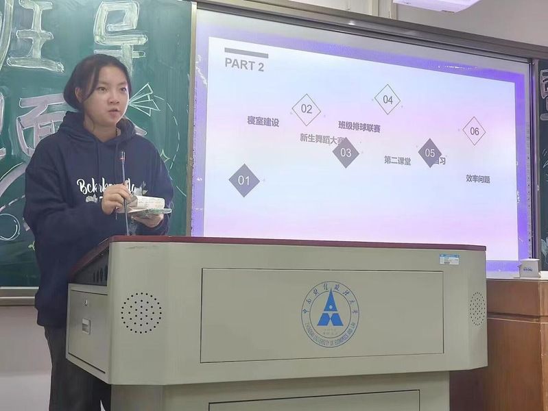 第四项内容为新生舞蹈大赛动员。团支书马安琪和文体委员冯怀莹作为新生舞蹈大赛负责人上台发言。两位同学展示了几个简短的舞蹈视频片段,简述了舞蹈的灵感来源与主题,并就人员分配和训练时间作了初步计划,号召全体同学参与其中,无论是在台前还是在幕后,都发挥出自己的力量。