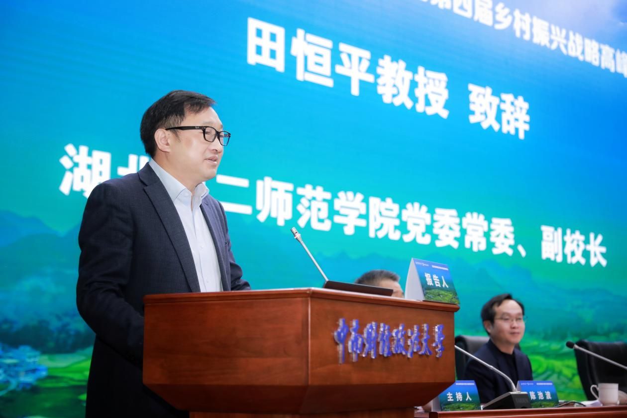 湖北第二师范学院副校长田恒平教授致辞表示,全面建设社会主义现代化国家最艰巨最繁重的任务在农村,最广泛最深厚的基础在农村,最充沛最强劲的潜力也在农村,期待大家务实合作、认真践行新发展理念、主动融入新发展格局、聚焦十四五时期农业农村工作的重点内容,开展深入研究,将论文写在大地上、让技术长在泥土里、把成果留在农夫家,为强农兴农乡村振兴提供有力的科技支撑、人才支撑,为推动农业农村现代化、加快建设农业强国做出更大贡献,并预祝本次论坛圆满成功。