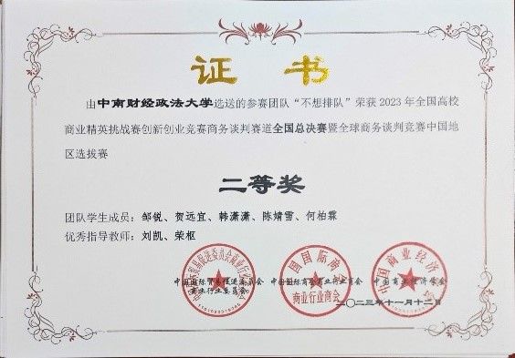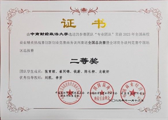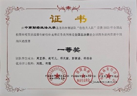 (通讯员 王泽宇 刘歆瑶)11月12日,历时三个多月的2023年全国高校商业精英挑战赛创新创业竞赛商务谈判赛道全国总决赛暨全球商务谈判竞赛中国地区选拔赛圆满落幕。由我院李芳副书记、刘凯副教授、何强老师指导并选派的包包大人队、专业团队和不想排队代表我校分别斩获全国一等奖和两个二等奖,国际经济与贸易专业的周芷彤同学和崔同锦同学获得“最佳谈判手”称号,三位老师获“优秀指导老师”称号。