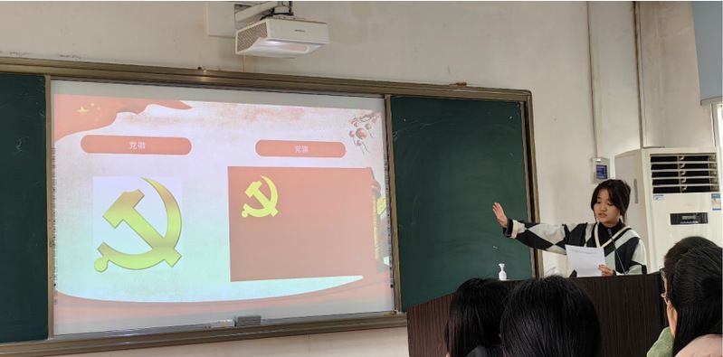 活动第七项,邝亦心同志展示如何规范使用党徽党旗、正确佩戴党员徽章。她首先讲解了党徽党旗的形制与意义,并就党徽和党员徽章为大家做了区分,然后展示了党员徽章的正确佩戴方式,加深了大家对党徽党旗的了解。