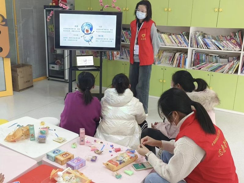阳光正暖,笑意正浓。志愿者们还在做准备工作时,就有两个小女孩结伴而来,迫不及待地在门口张望。活动开始,志愿者们便为小孩科普起基础的太空知识。病房一角的电脑播放着有趣的太空视频,患儿们目不转睛,全神贯注于神秘的宇宙之中。到了深入讲解太空知识环节,她们接二连三提出的问题也被志愿者们一一耐心解答。欢声笑语中,患儿们与志愿者之间的距离被拉近,温暖在每个人心中蔓延。