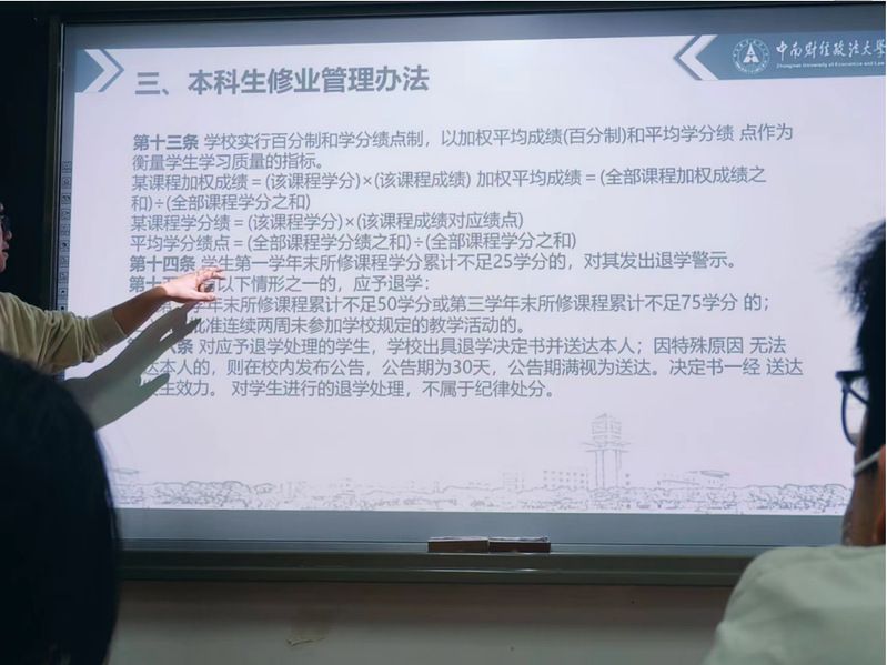 二明规矩——评优评先、考研保研。针对一部分同学对于评优评先与考研保研相关的提问,何强老师首先推荐学院统一推送的《学生操作手册》,其中有关大学生活的介绍事无巨细都在其中。之后何强老师从综测、奖学金与管理办法三个方法,展开详细讲解。